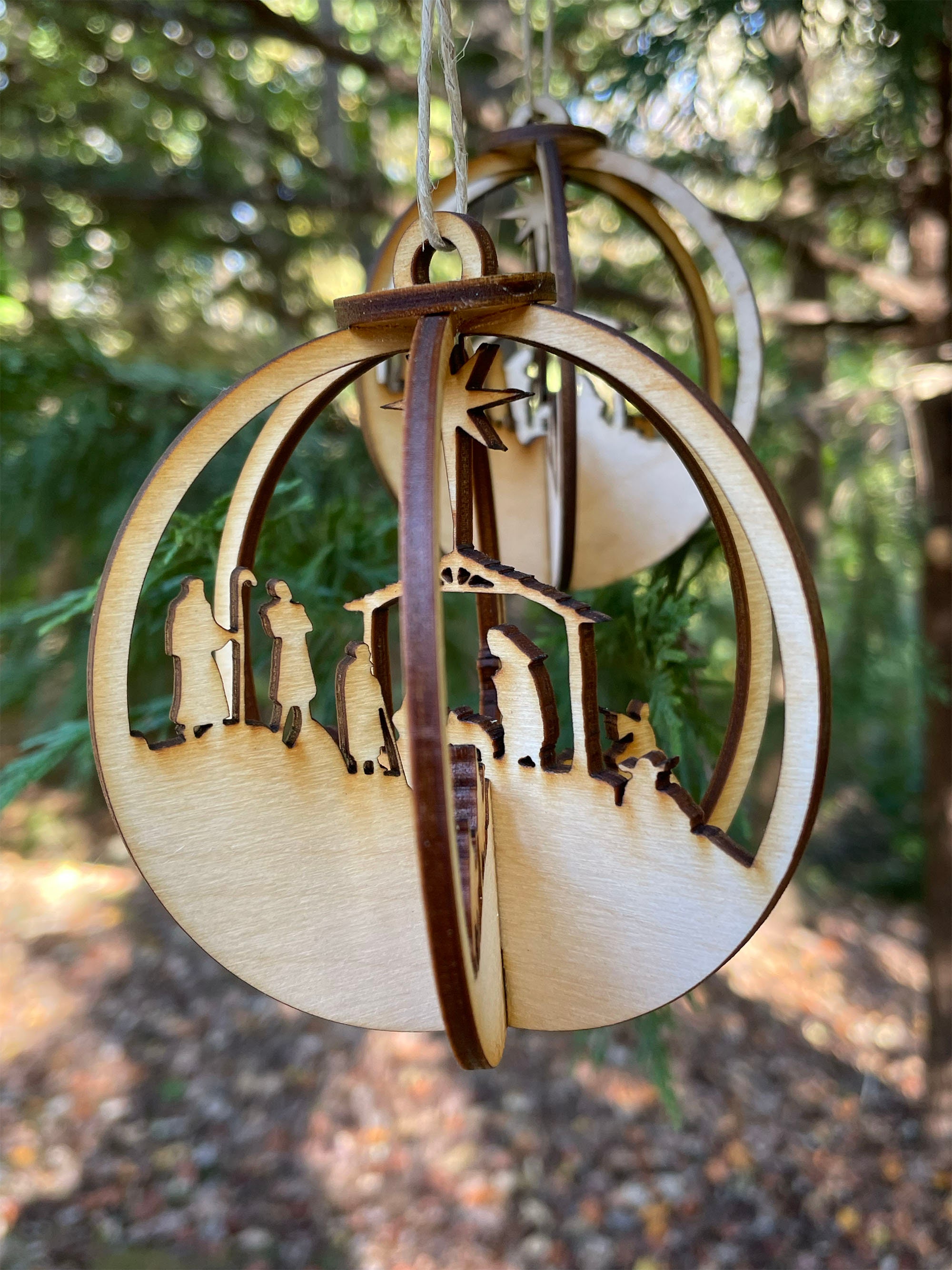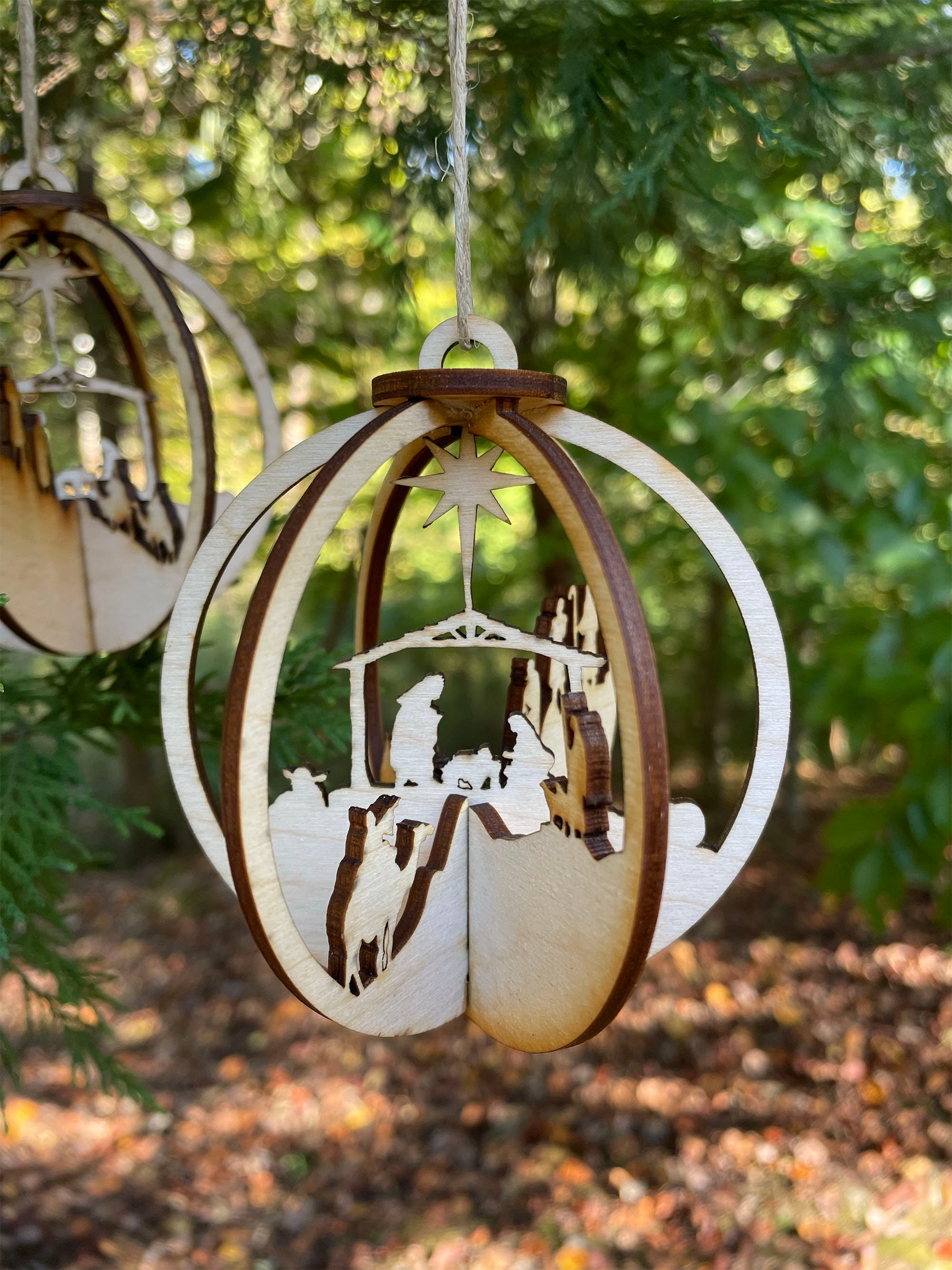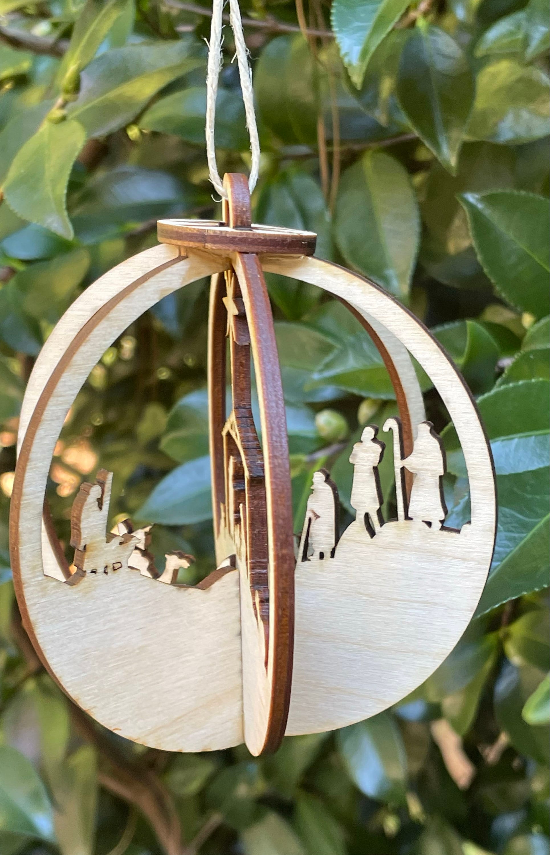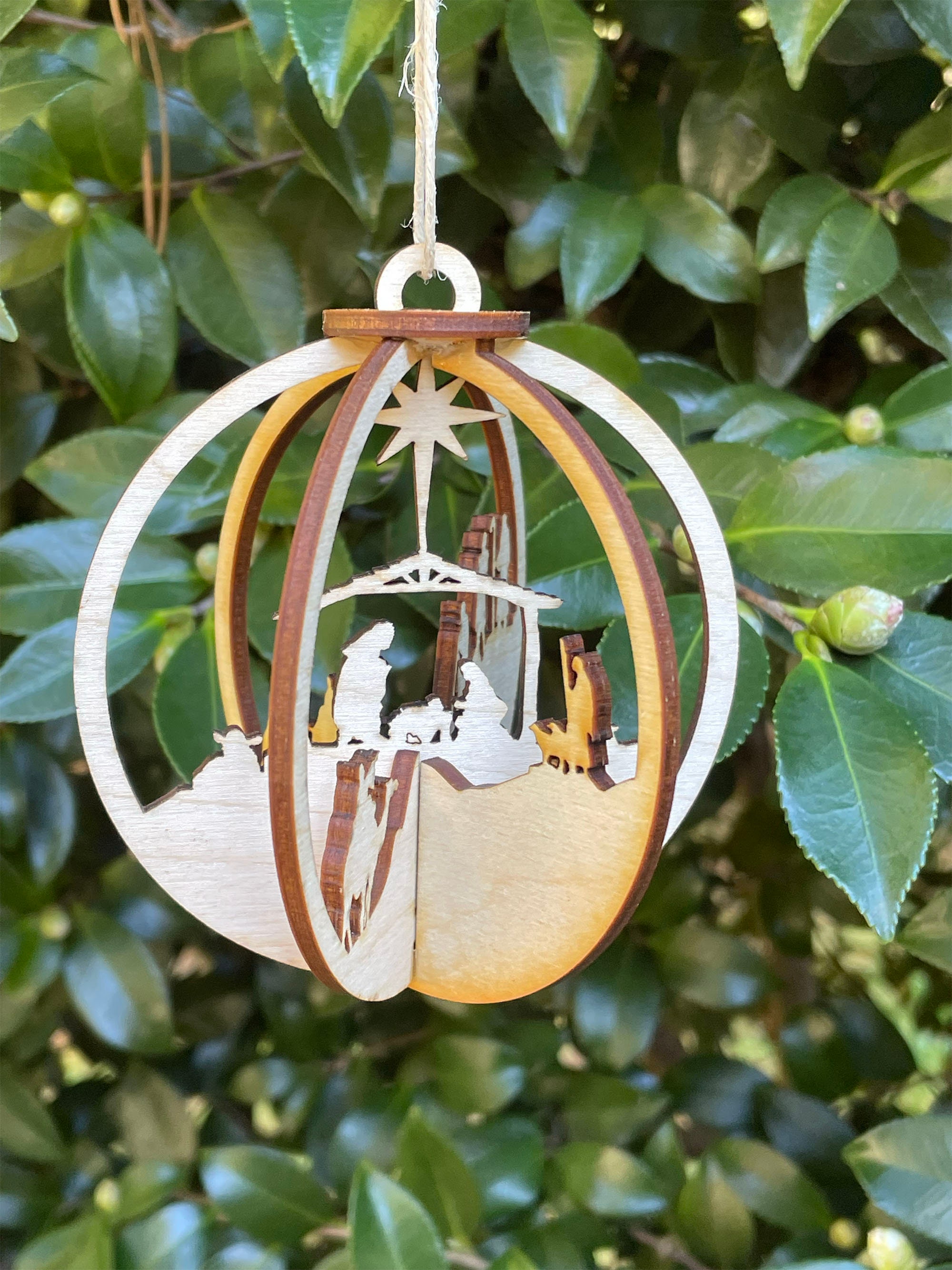 A beautiful 3 Dimensional Nativity Scene Christmas Ornament. This is a Laser Cut, Hand Assembled Christmas Ornament. Cut From FSC Certified Baltic Birch Plywood. This beautiful ornament has three dimensions. 3.5" inches in diameter. Simple, Clean, a Tribute to that story of old. In case you need a reminder the story is here in the Holy Scripture. It is what Christmas is all about in the first place.