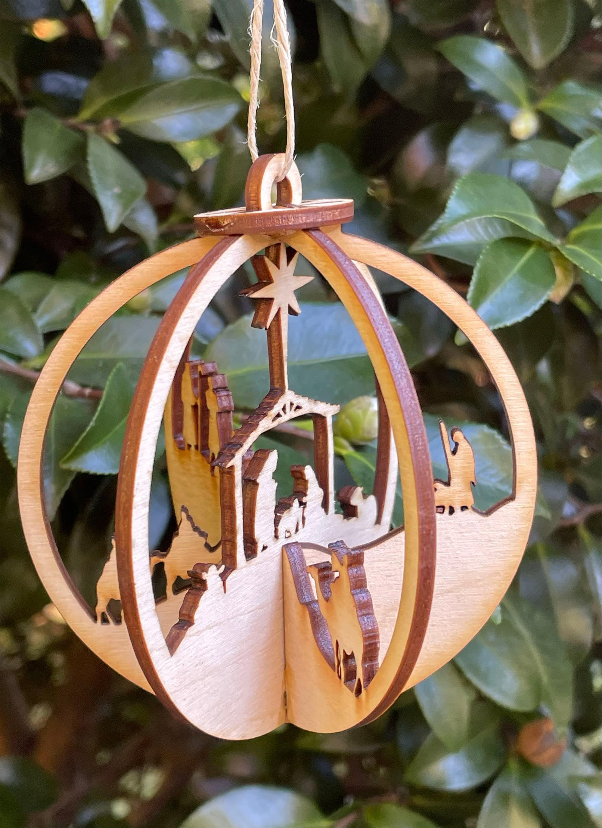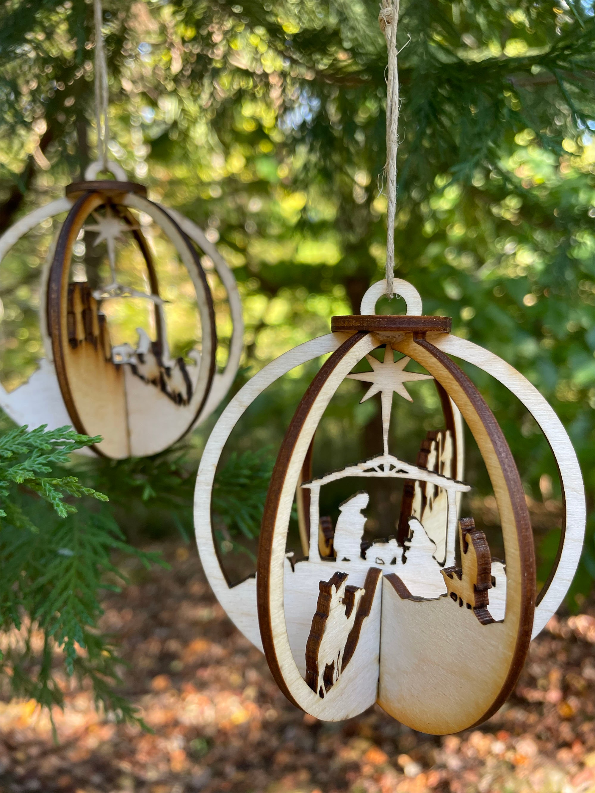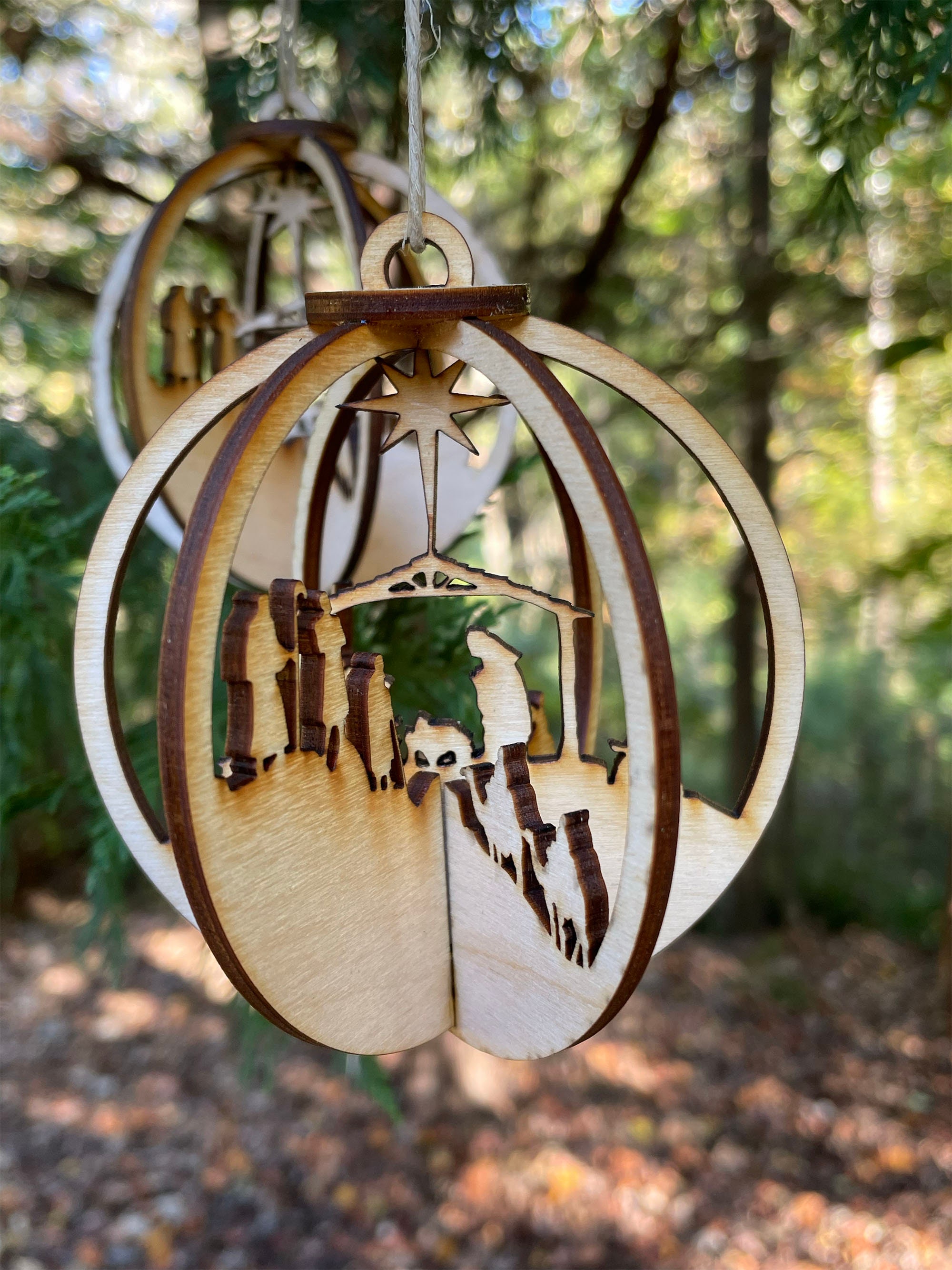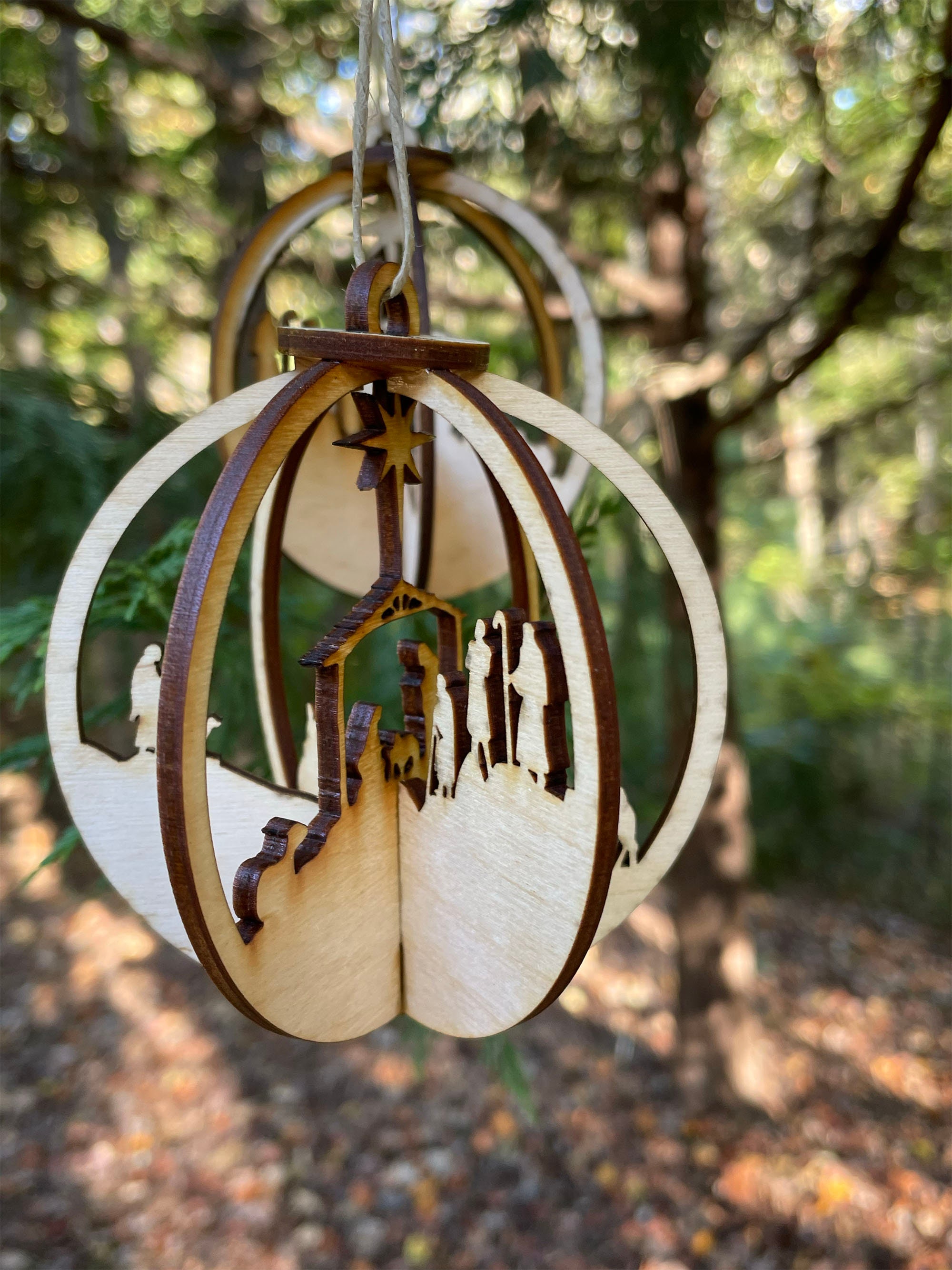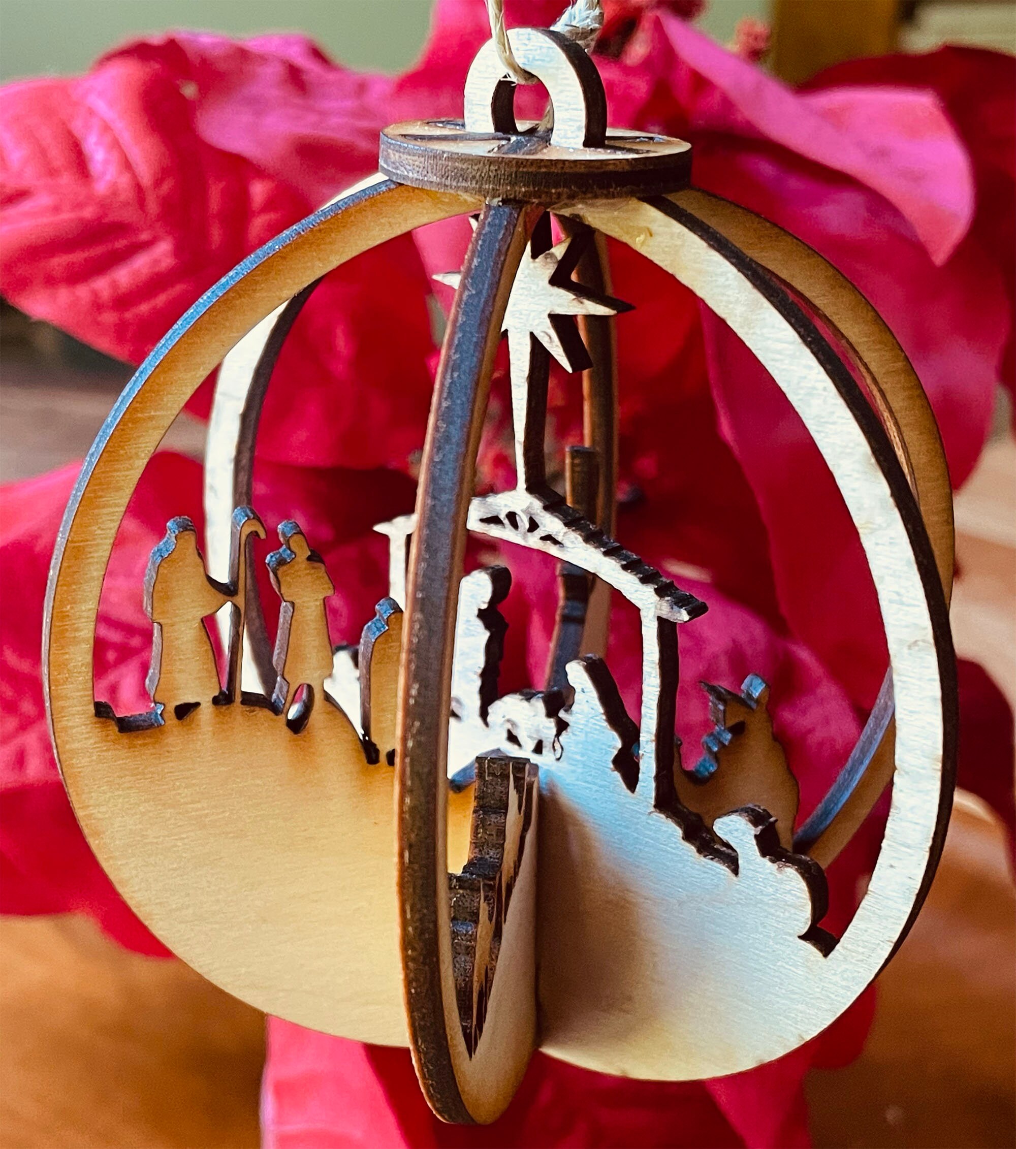 A beautiful 3 Dimensional Nativity Scene Christmas Ornament. This is a Laser Cut, Hand Assembled Christmas Ornament. Cut From FSC Certified Baltic Birch Plywood. This beautiful ornament has three dimensions. 3.5" inches in diameter. Simple, Clean, a Tribute to that story of old. In case you need a reminder the story is here in the Holy Scripture. It is what Christmas is all about in the first place.