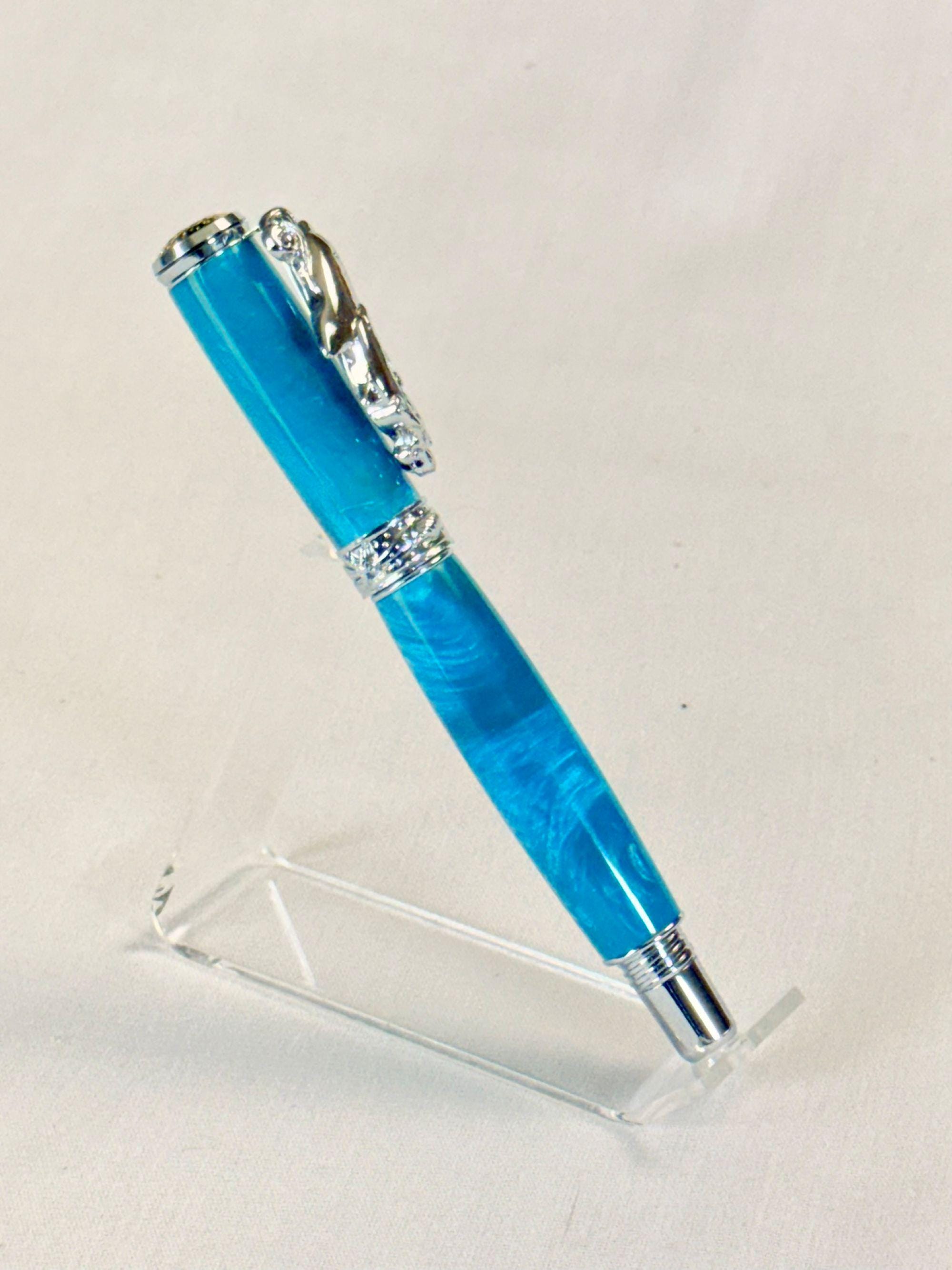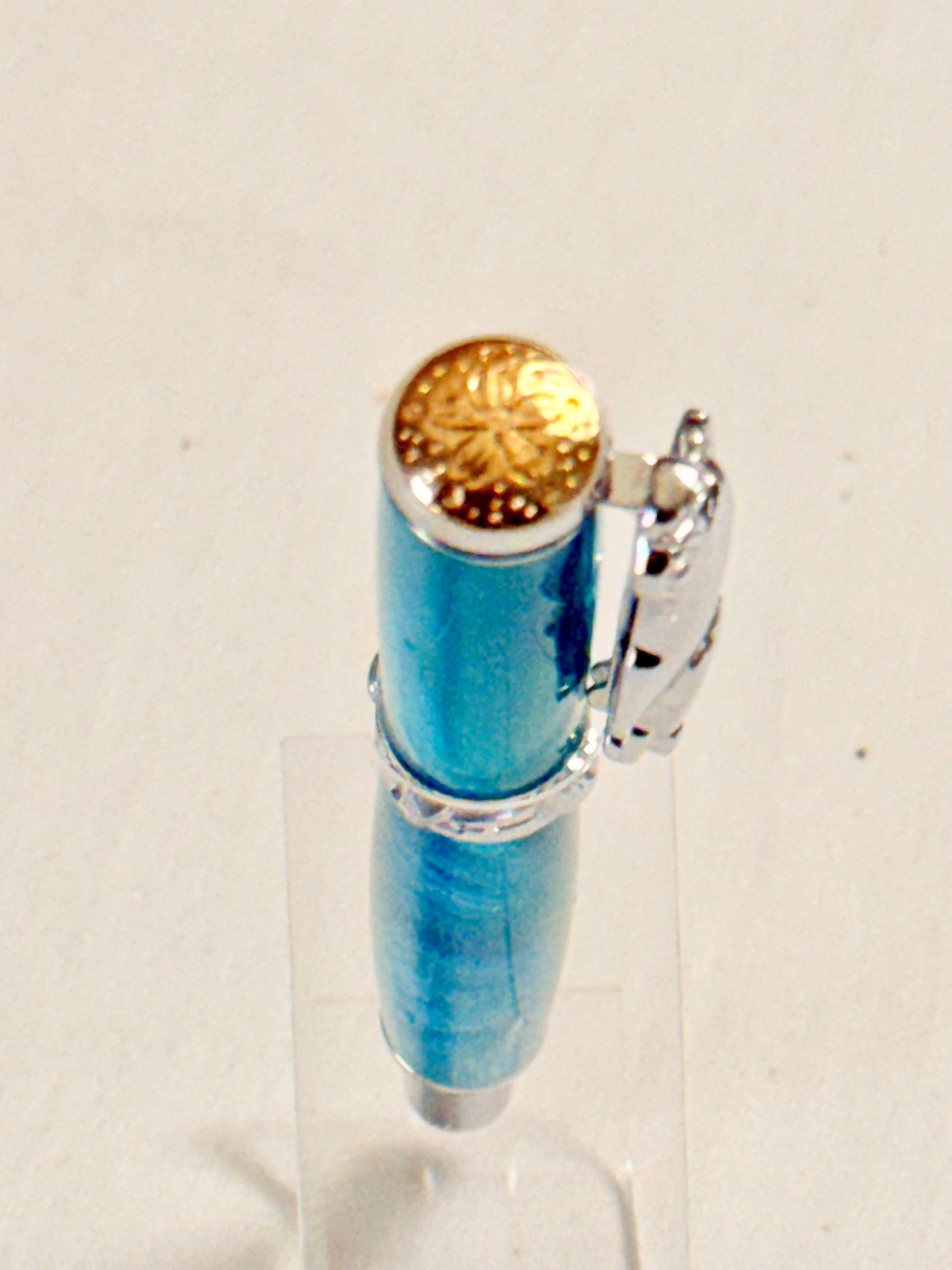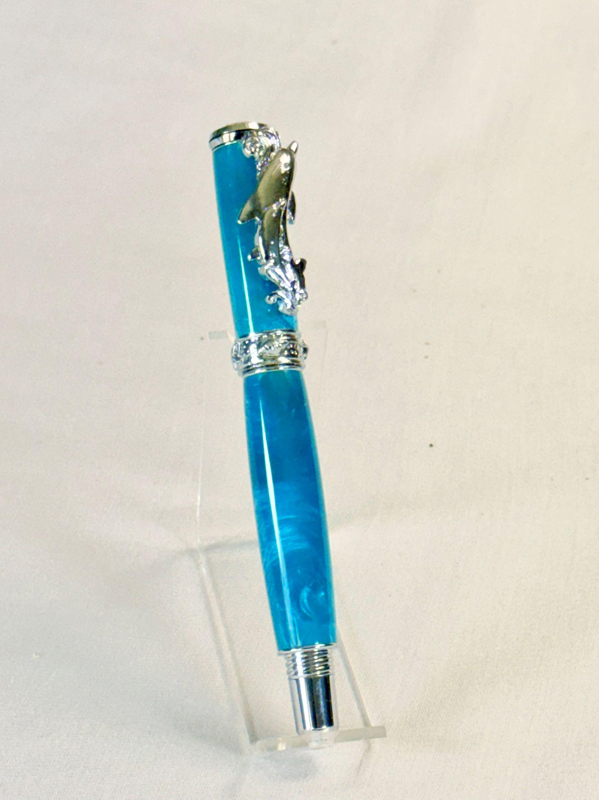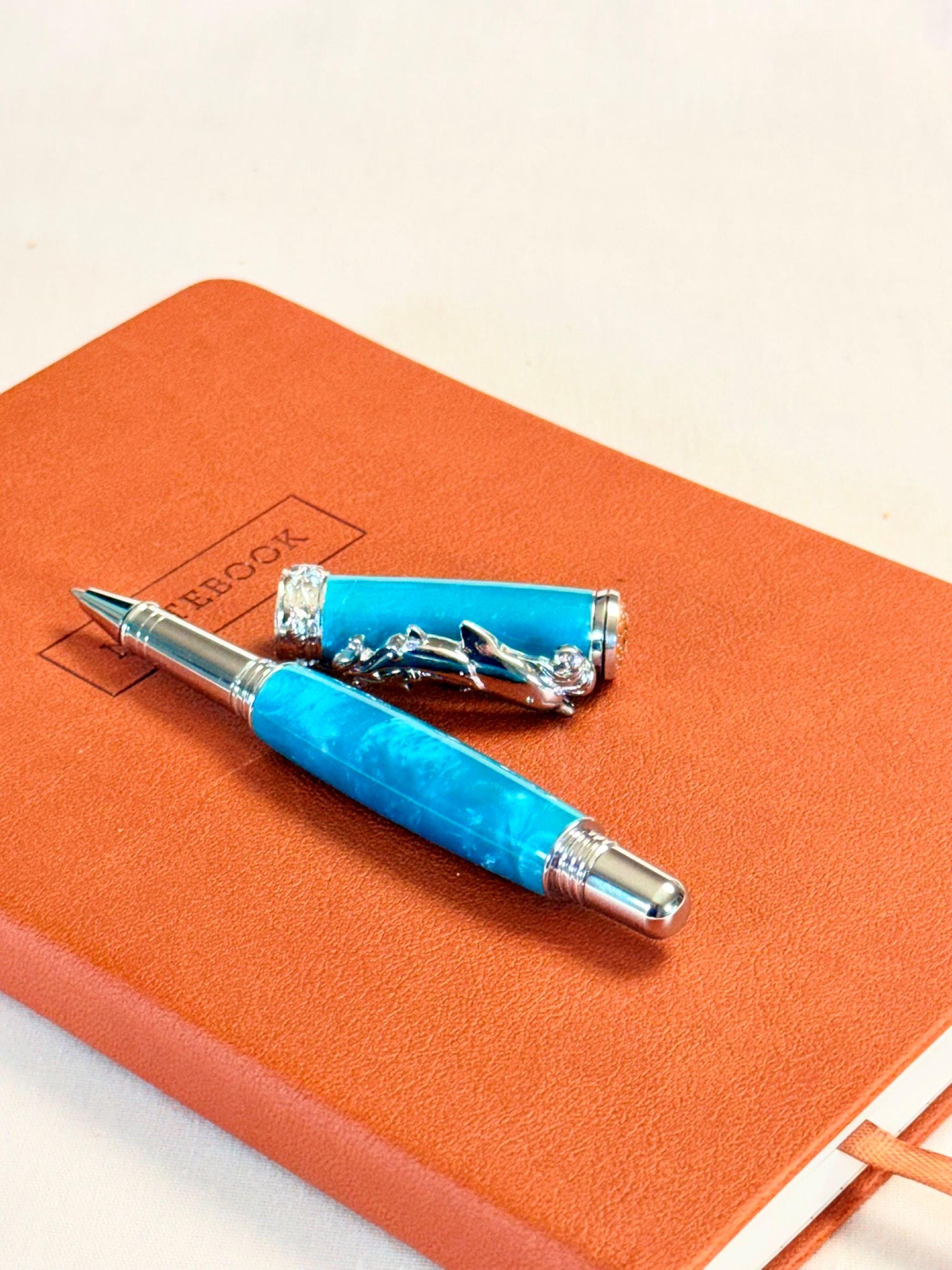 Bring the beauty of the ocean to your desk with this handcrafted beach-themed rollerball pen. Designed for ocean lovers and coastal dreamers, this Aqua dolphin pen captures the serenity and wonder of marine life.
