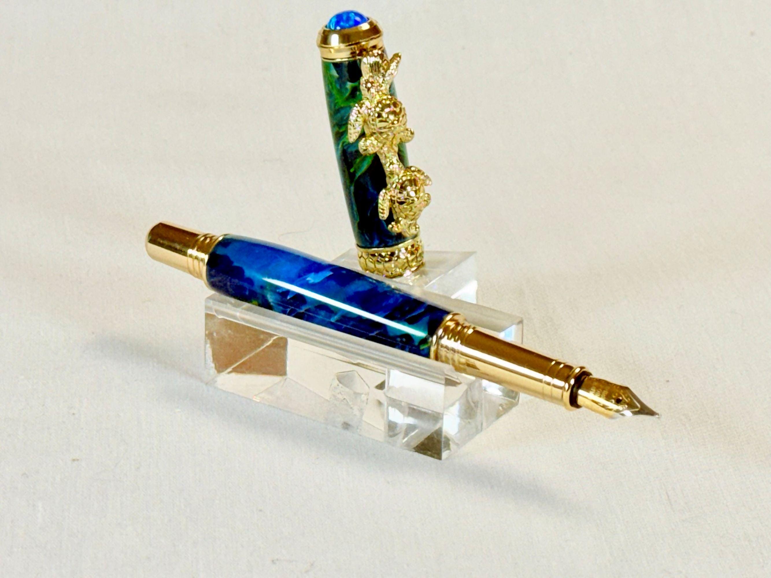 Dive into endless summer vibes with this handmade Sea Turtle Rollerball Pen, featuring 24k Gold accents and a sparkling Fire Opal top.