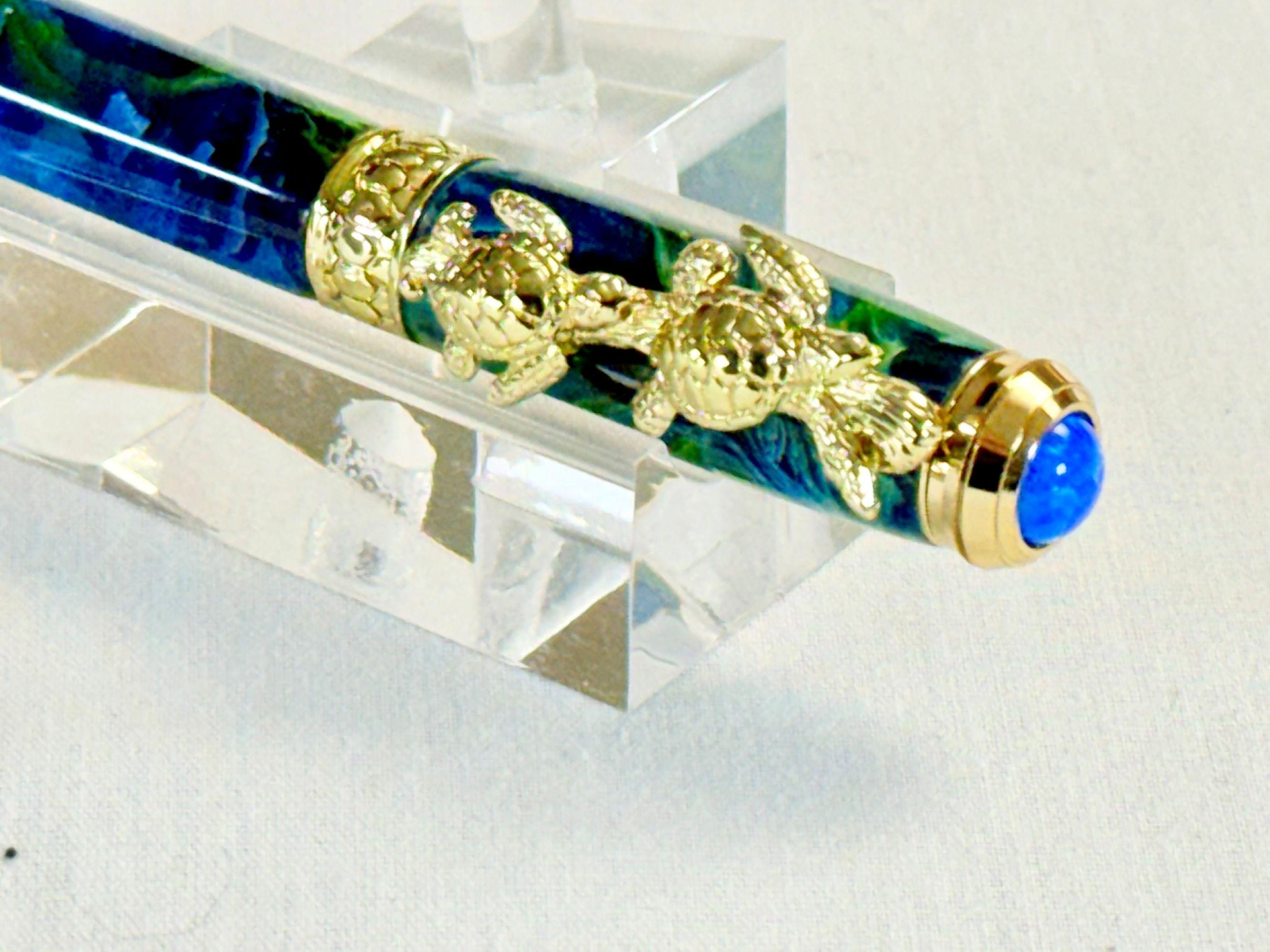 Handmade sea turtle rollerball pen with Chrome accents, Fire Opal top, and ocean-inspired acrylic. Perfect beach lover or turtle enthusiast gift.