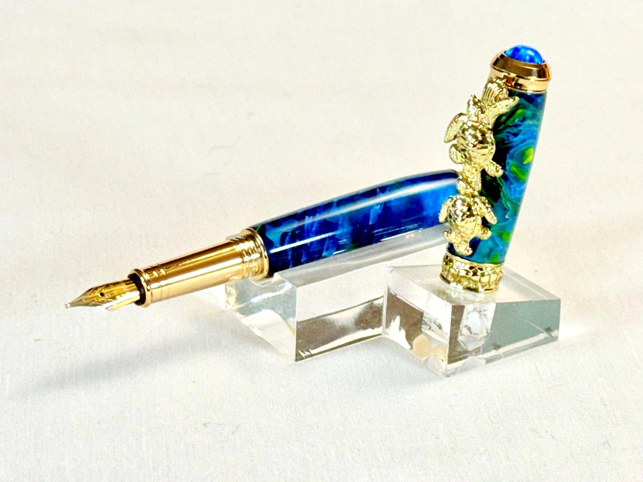 Crafted for ocean lovers and beach dreamers, this pen showcases stunning Ocean Mist acrylic that swirls like tropical waters over coral and white sand. A graceful sea turtle clip and a textured turtle shell center band complete the marine theme, offering a unique writing experience you’ll treasure.