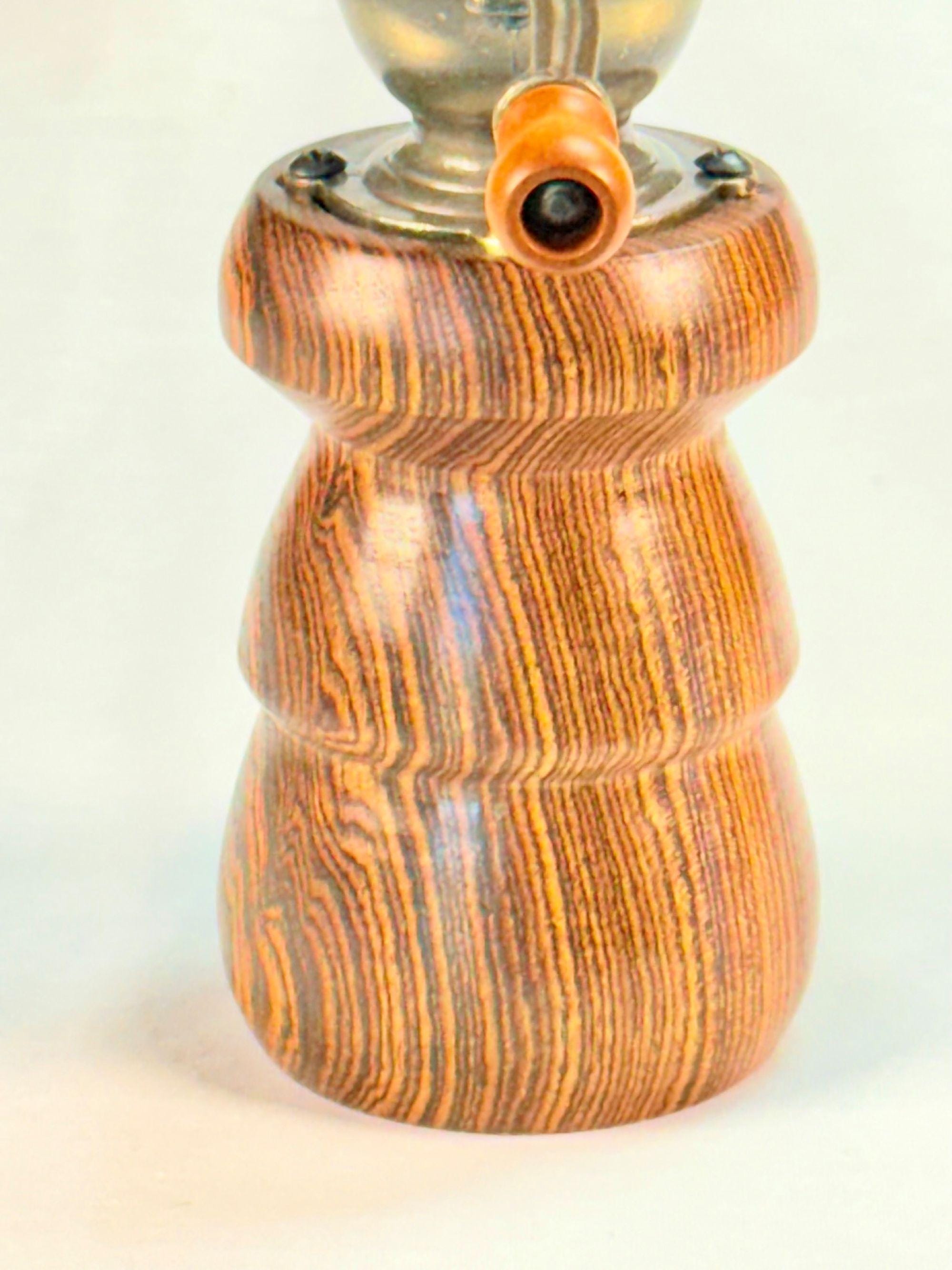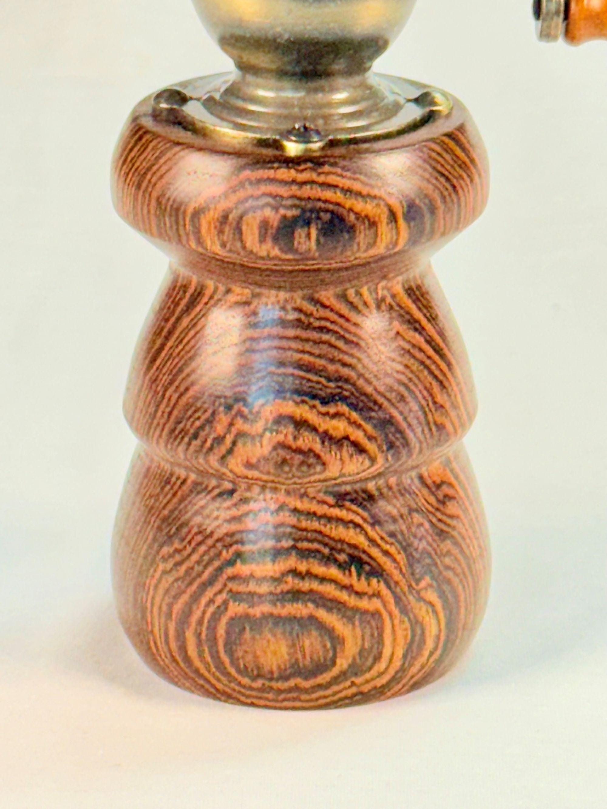 I use only the finest pepper mill hardware available with hard durable plating and hardened steel or fired ceramic grinding mechanisms. Once the pepper mill body and the mechanical hardware are joined, the pepper mill receives a final buffing to make it shine. My goal is not just to make pepper mills, but to produce beautiful art that is useful.