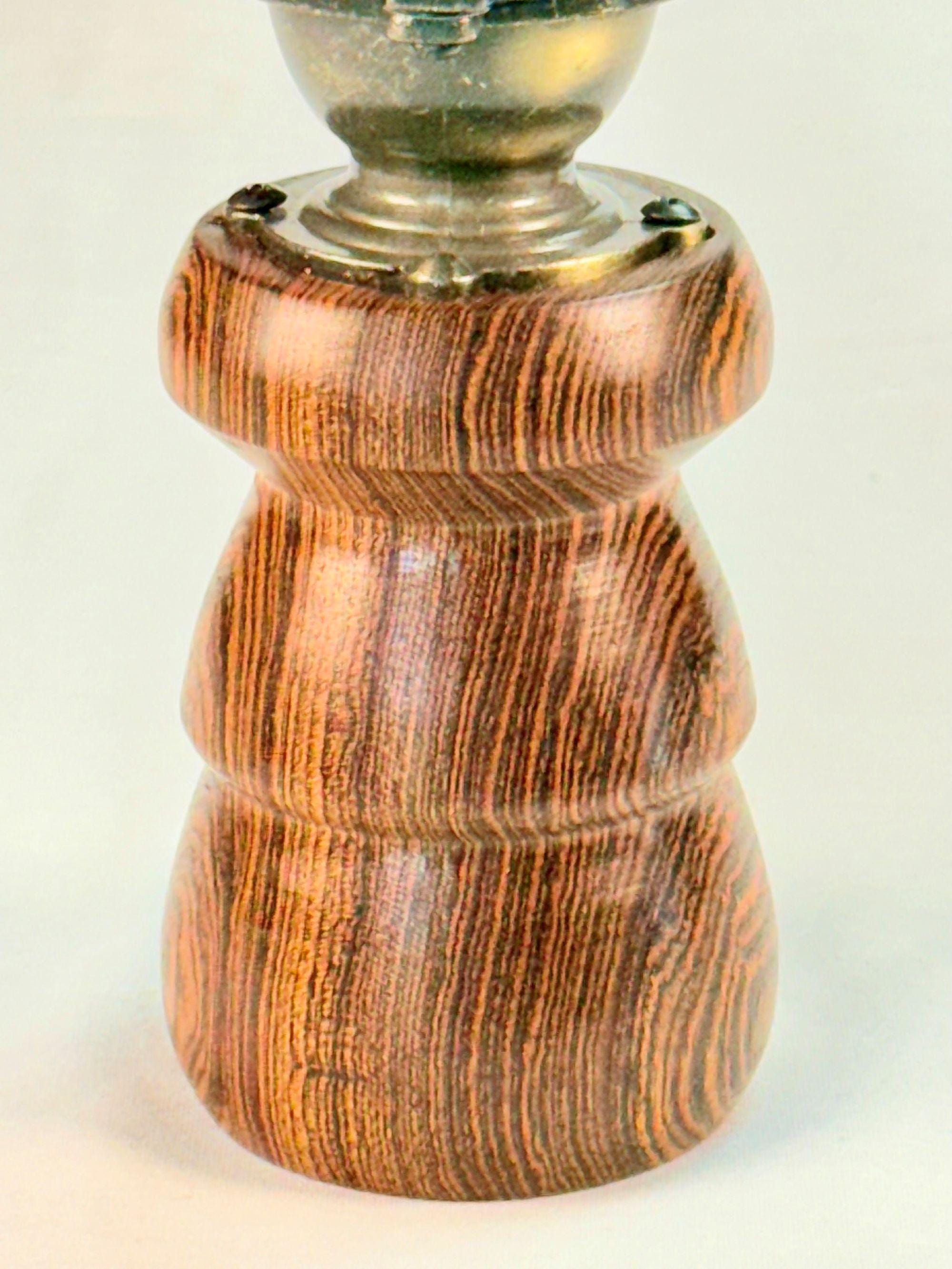 Each pepper mill is individually handmade by me, artist-craftsman Alan Huey, in a small shop in Wake Forest North Carolina. Every piece used for the pepper mill body is handpicked with care to match the rustic nature of the pepper mill hardware. Materials consist of; various domestic hardwoods, exotic woods, highly figured burl woods, and tropical hardwoods. The pepper mill body is shaped on a lathe freehand. Each and every pepper mill is one-of-a-kind due to natural variations in the figure of the grain of the wood, natural variations of the coloring of the material and the free handed turning (shaping). Before the pepper mill body is joined with the mechanical hardware it is shaped and smoothed using a 12 – 15 step finishing process depending on the body type. Then the body is polished, buffed and waxed with a hard durable wax to help protect the finish of the body. Each and every step performed by hand. There is no superior quality anywhere.