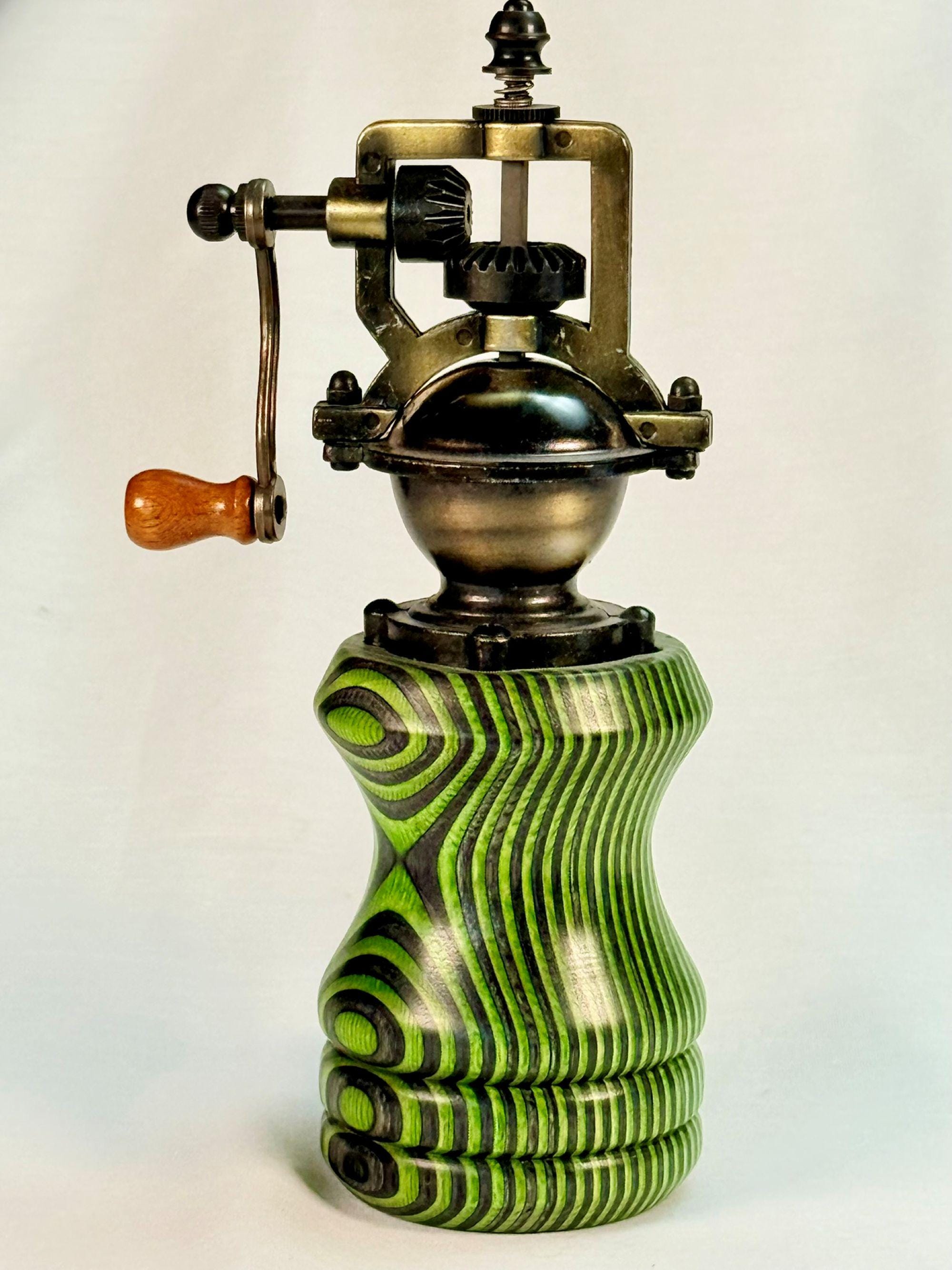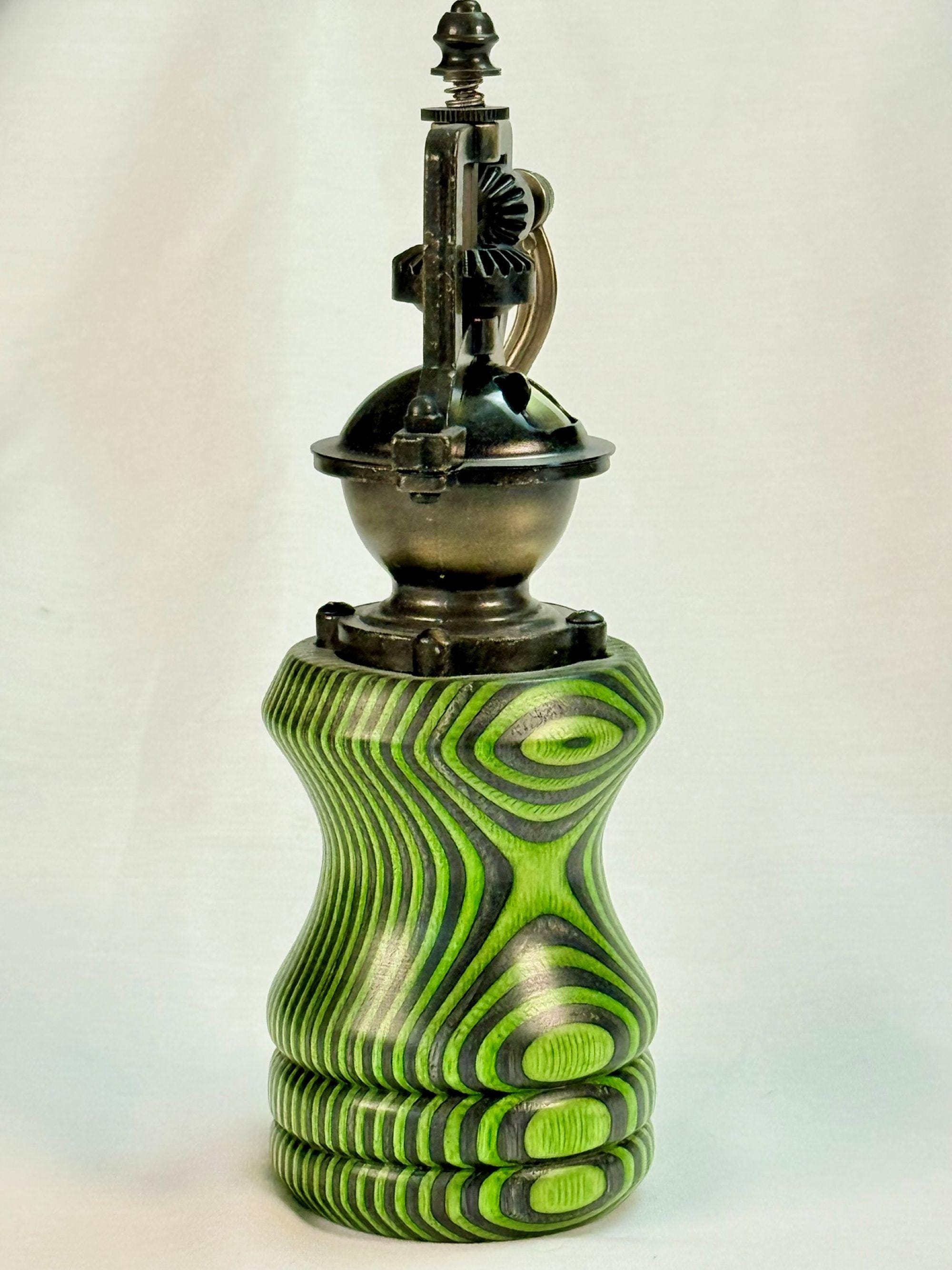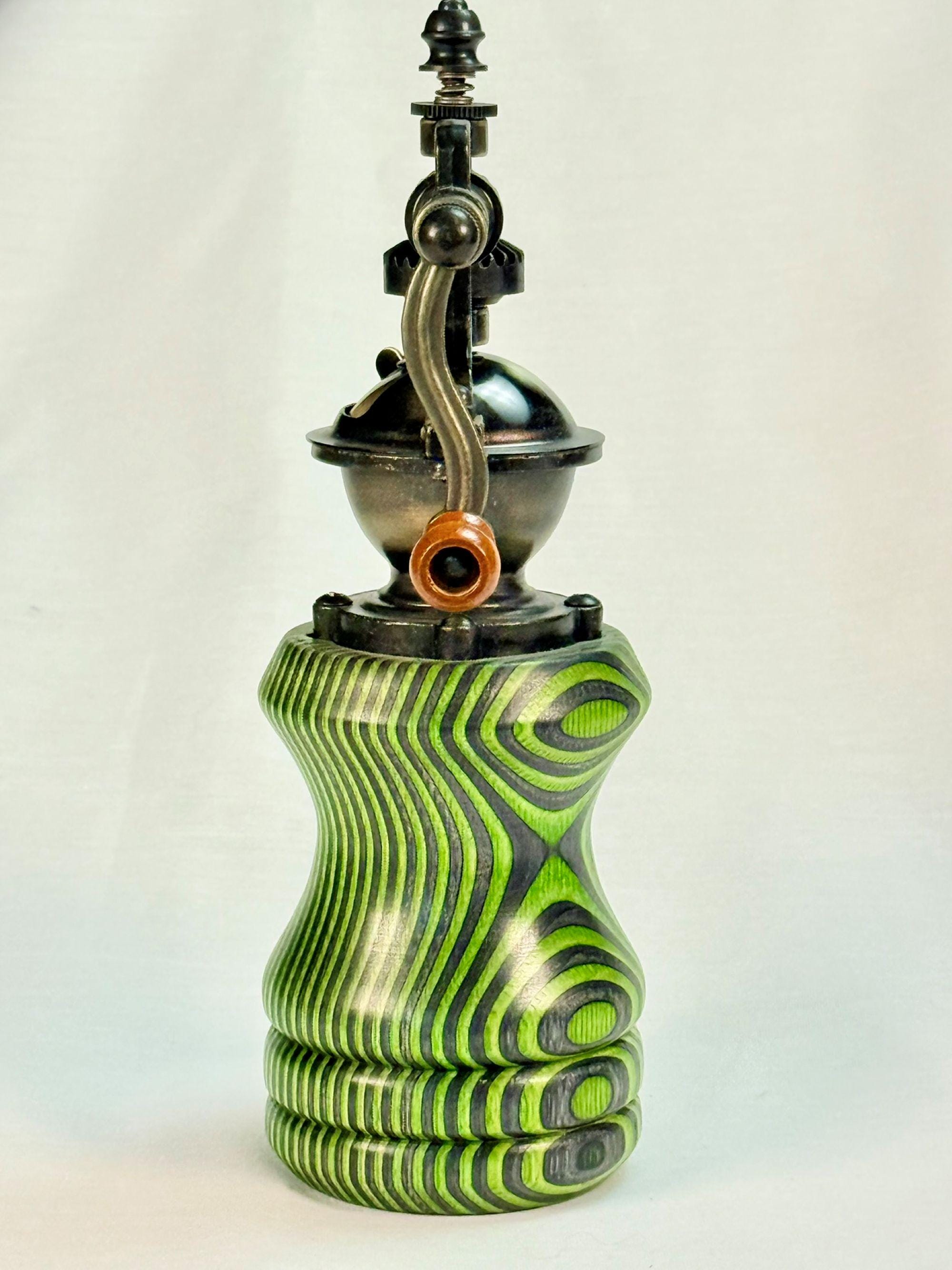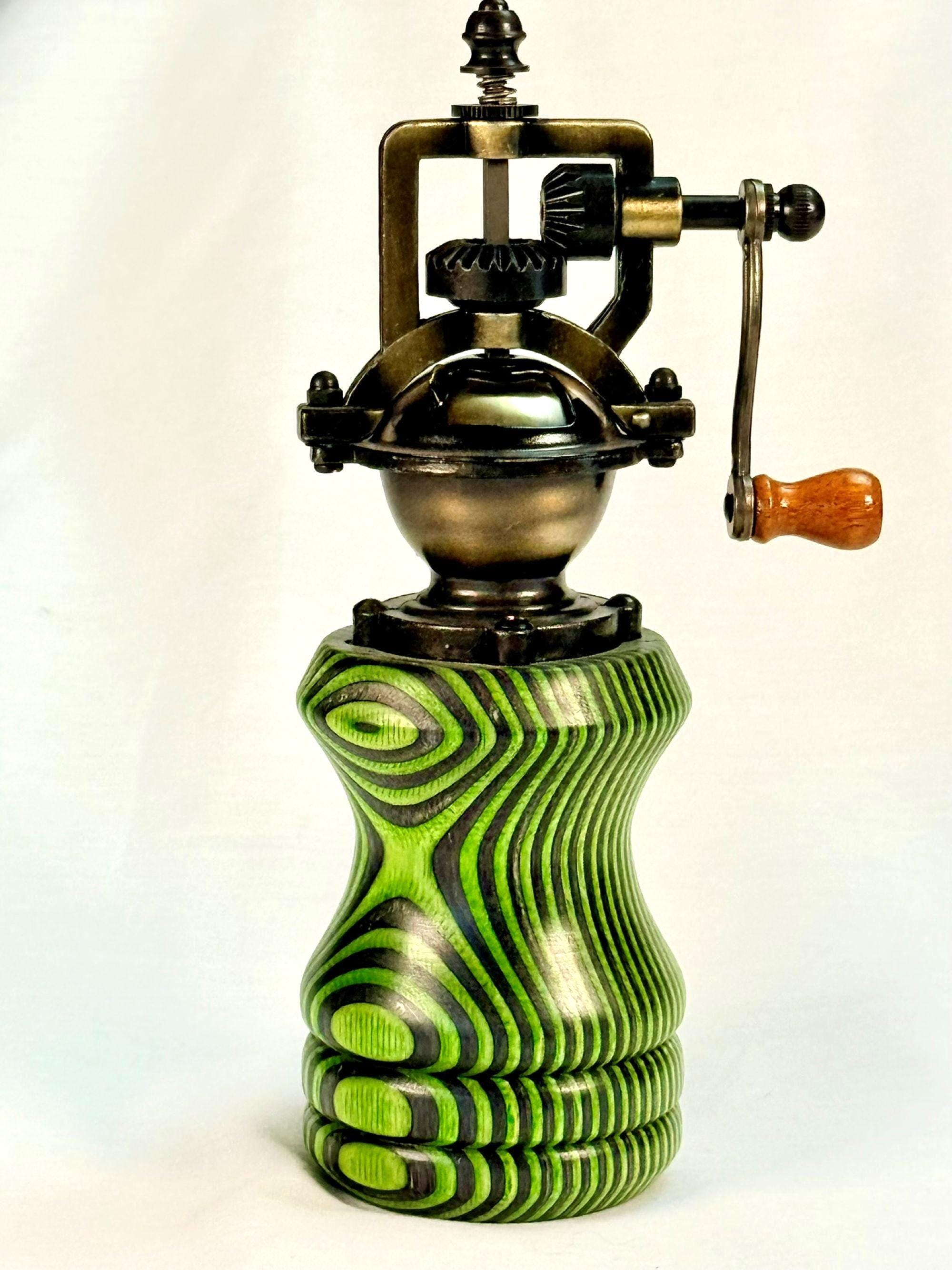 This vintage style pepper mill has body made from Spectraply Wood in the color called Green Hornet. The body is 4" tall with overall height of 8". Diameter is 2". Grind coarseness is adjusted by thumb screw at top of unit. This classic vintage style will add character to any kitchen or table. The wood is stunning. It may just become the center of conversation at dinner.