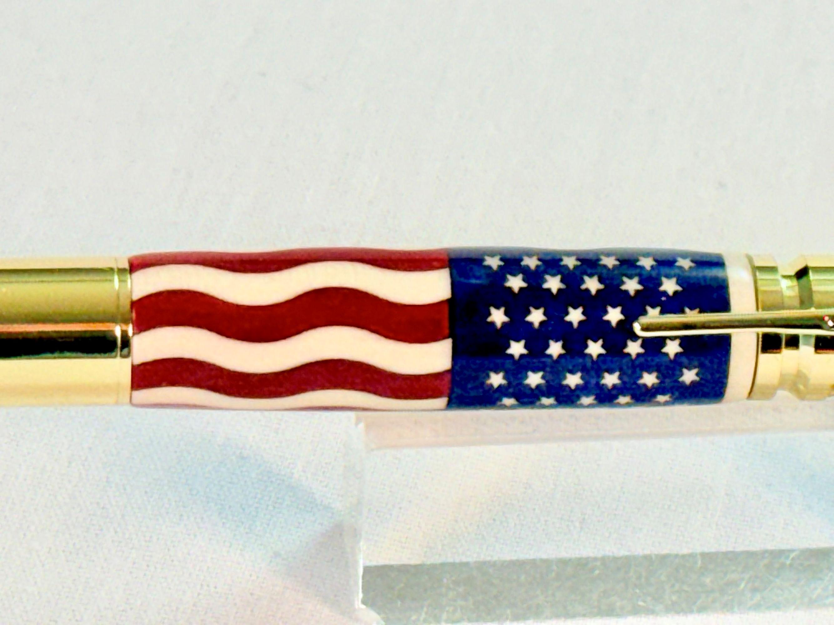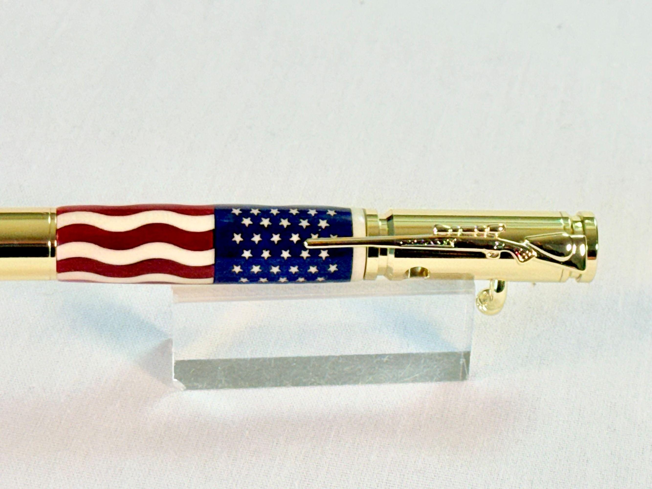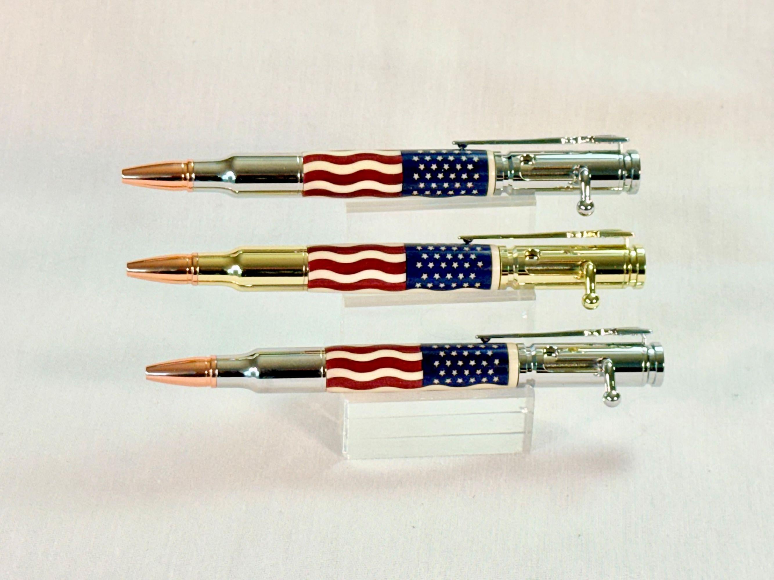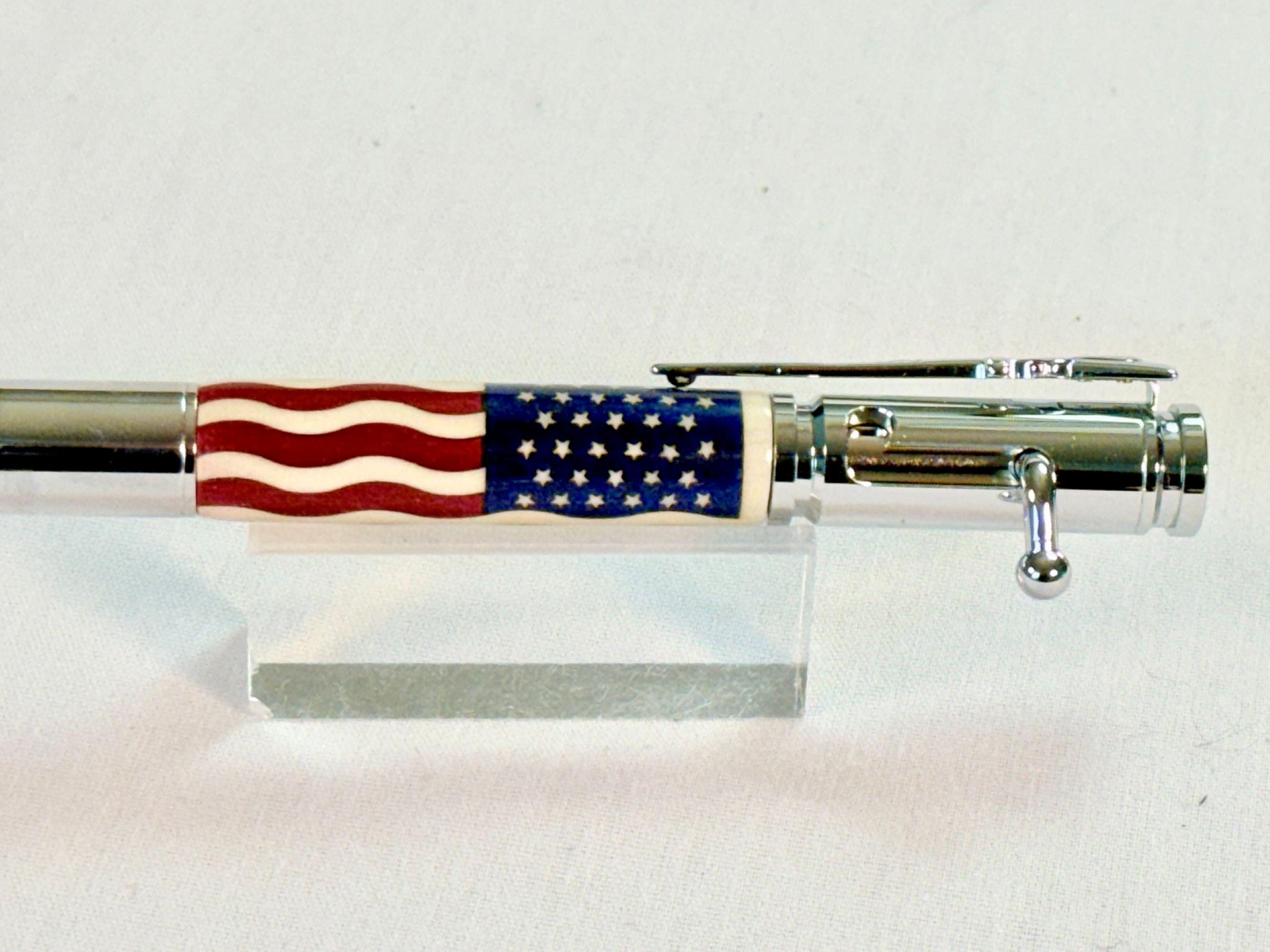 Celebrate American Patriotism with a Handmade Bolt Action Bullet Pen – Featuring a Hand Inlaid Wooden American Flag! Perfect to celebrate America's 250th Anniversay.