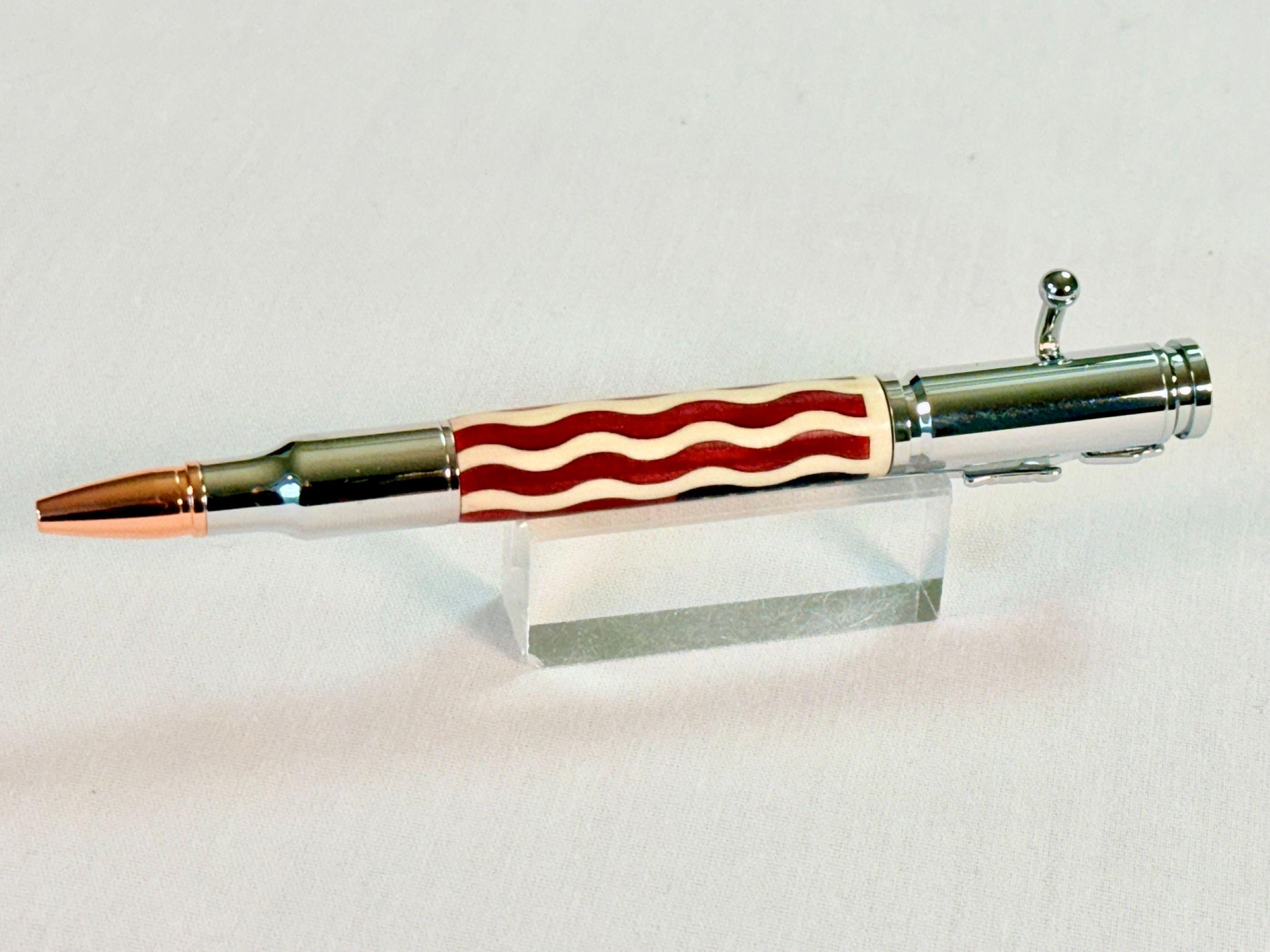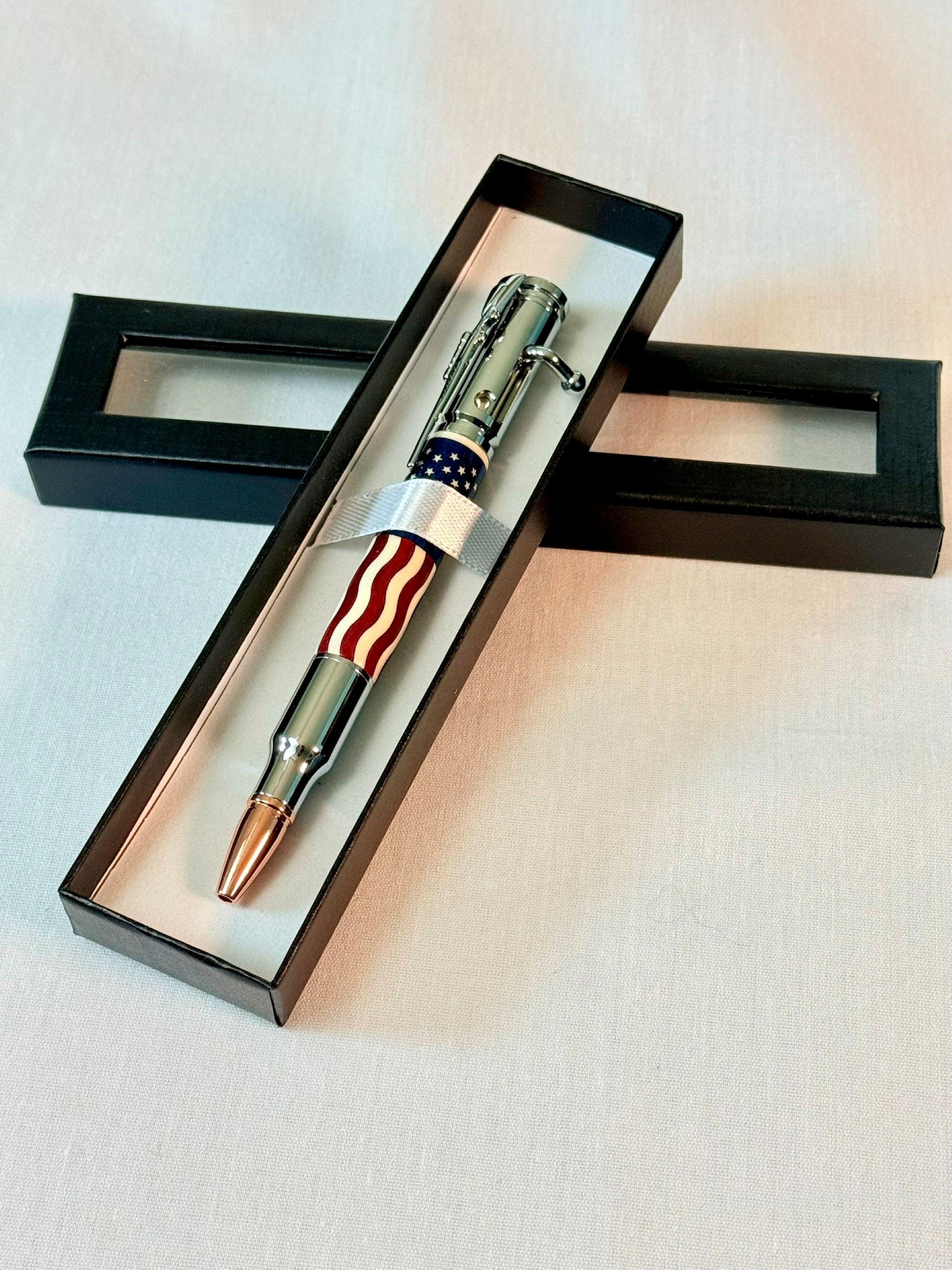 Looking for the perfect patriotic gift for a hunter, military veteran, gun enthusiast, or American patriot? This 30 Caliber Bolt Action Bullet Pen is a one-of-a-kind writing instrument that proudly showcases the stars and stripes. Made from 65 hand-inlaid wood segments, the body displays a precision-crafted American flag—each pen is shaped and finished on a lathe for smooth handling and heirloom quality.