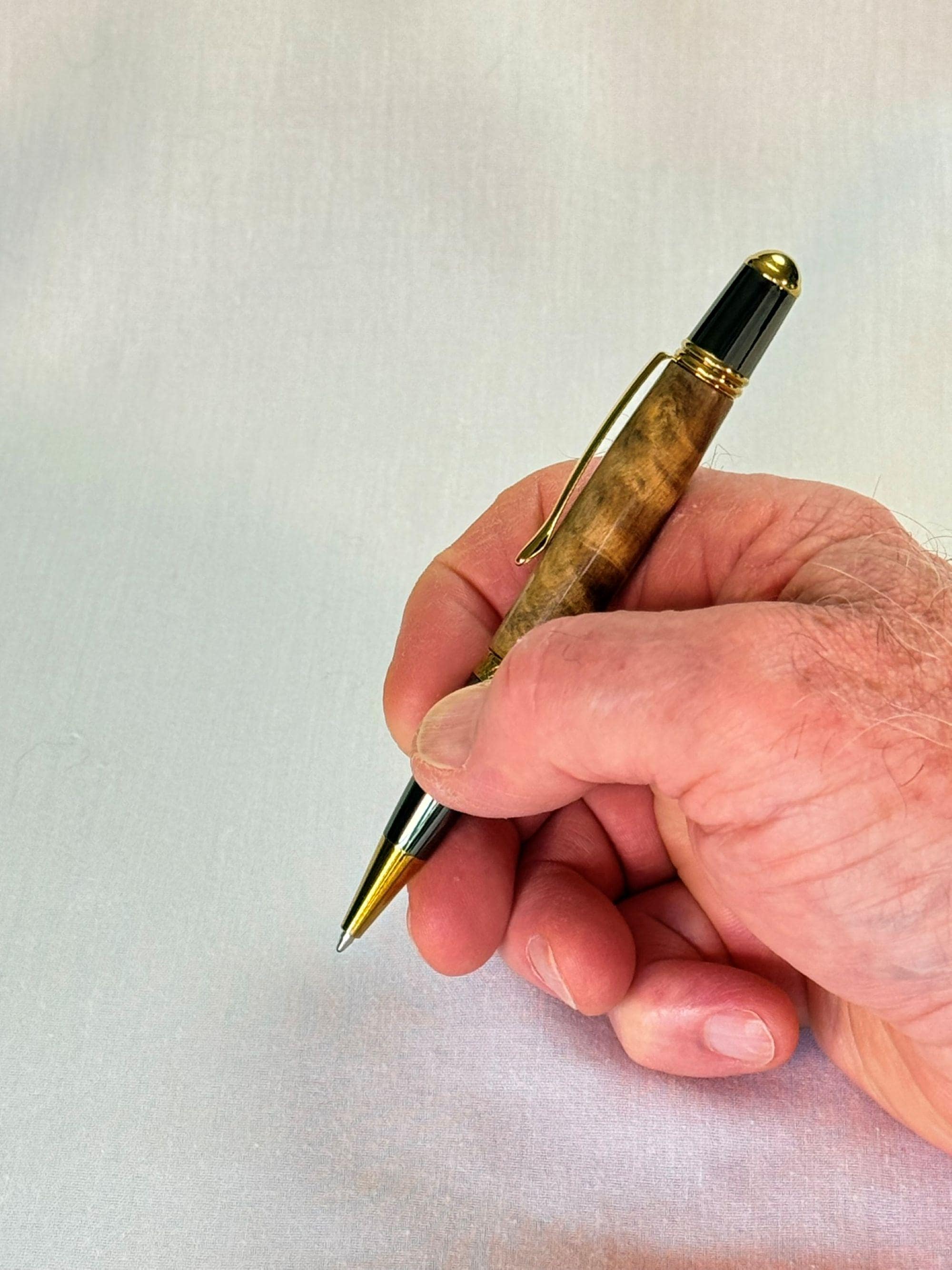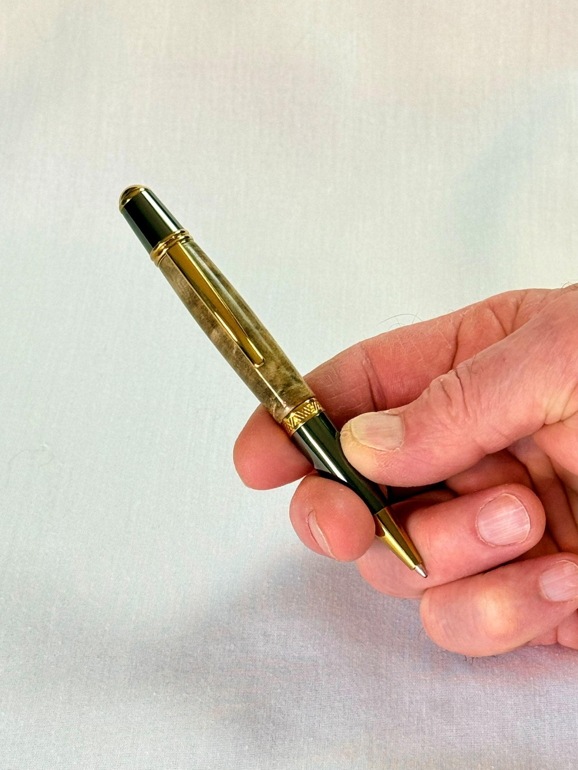 Each pen is individually handmade by me, artist-craftsman Alan Huey, in a small shop in Wake Forest North Carolina. Every piece used for the pen body is handpicked with care to match the mechanical hardware of the pen. Materials consist of; various domestic hardwoods, exotic woods, highly figured burl woods, dyed acrylic, metals, stone, or items such as mother of pearl encased in resin. The pen body is shaped on a lathe freehand. Each and every pen is one-of-a-kind due to natural variations in the figure of the grain of the wood, natural variations of the coloring of the material and the freehanded turning (shaping). Before the pen body is joined with the mechanical hardware it is shaped and smoothed using a 12 – 15 step finishing process depending on the body type. Then the body is polished, buffed and waxed with a hard durable wax to help protect the finish of the body. Each and every step performed by hand. There is no superior quality anywhere.