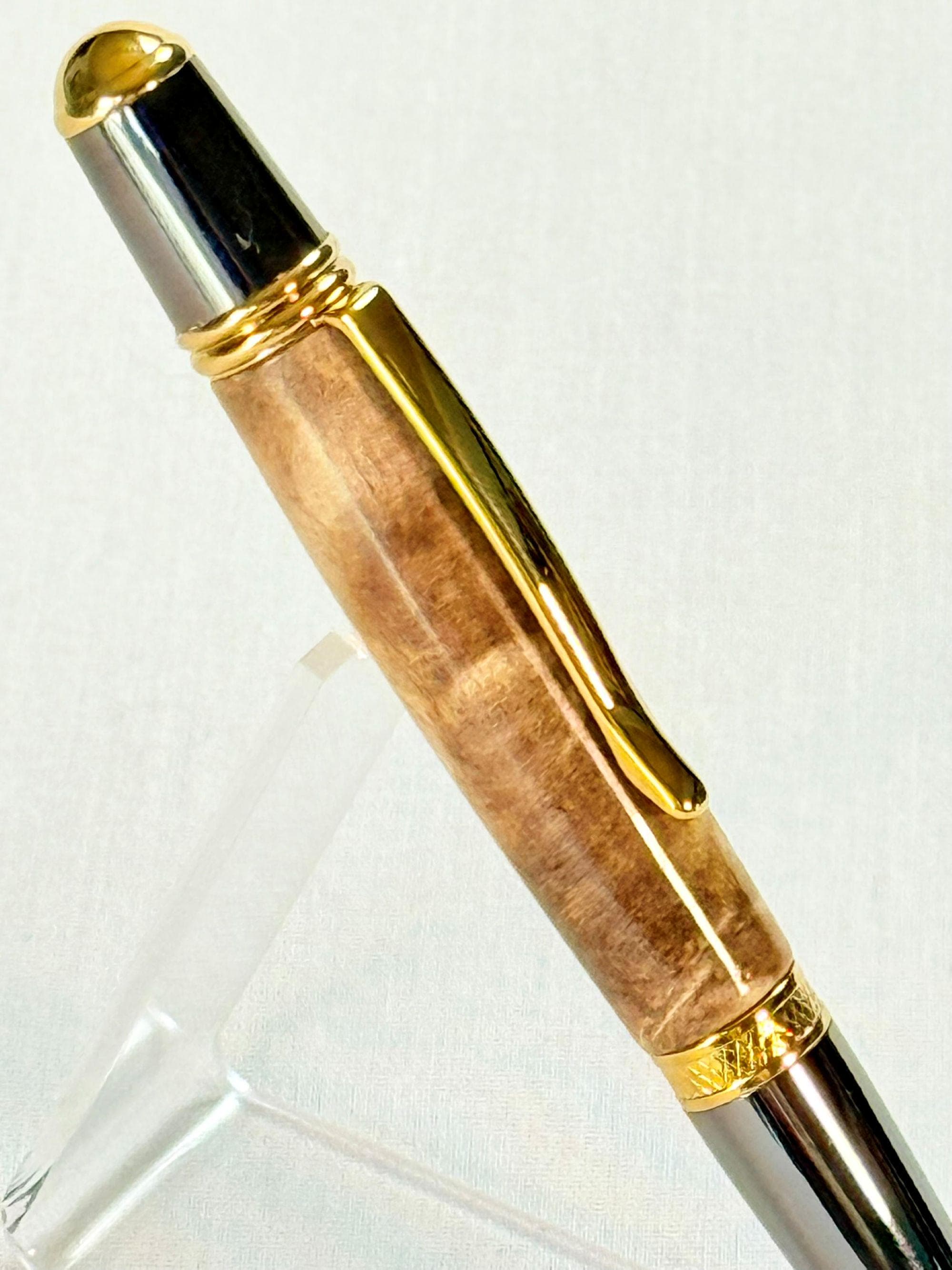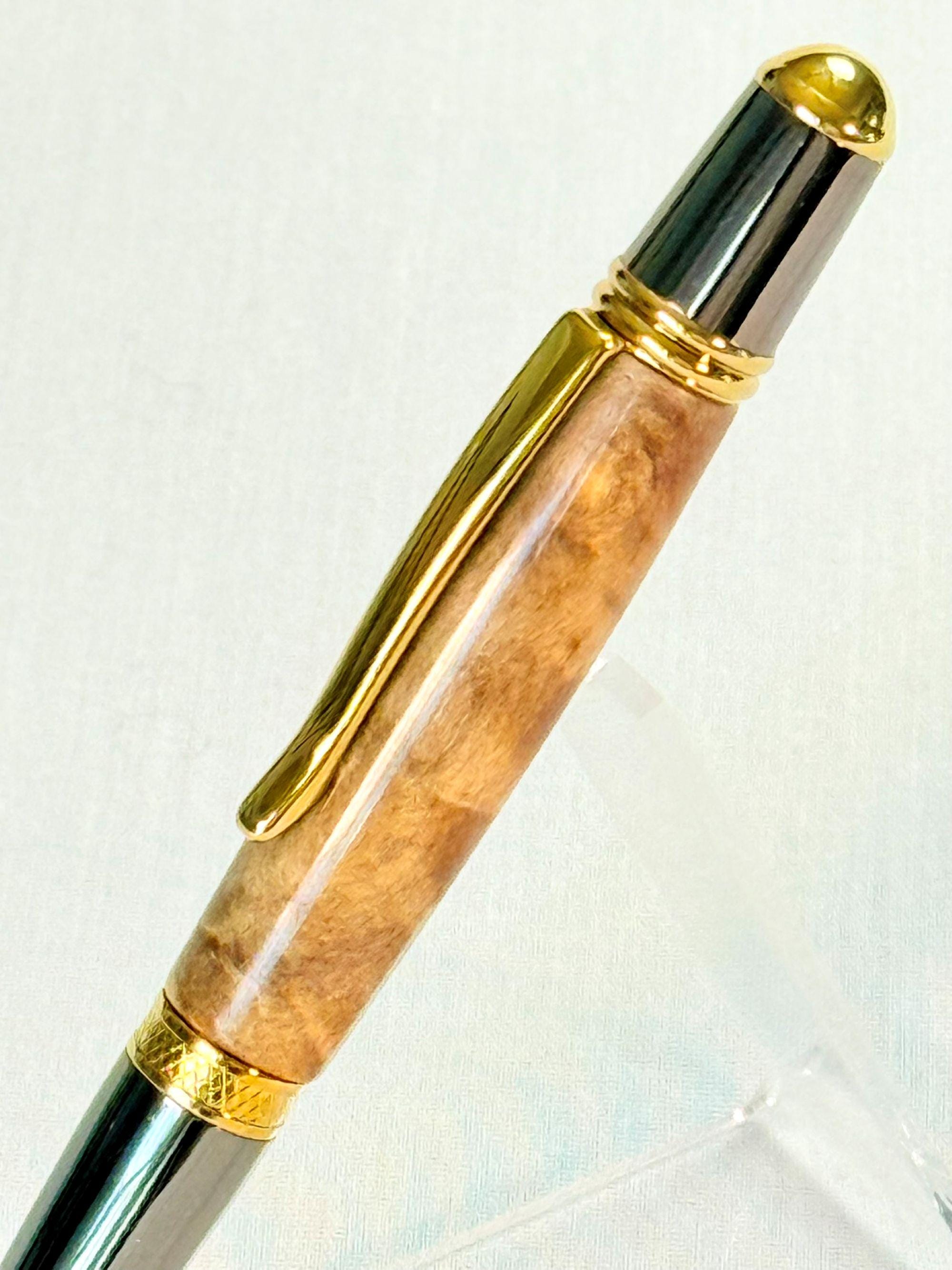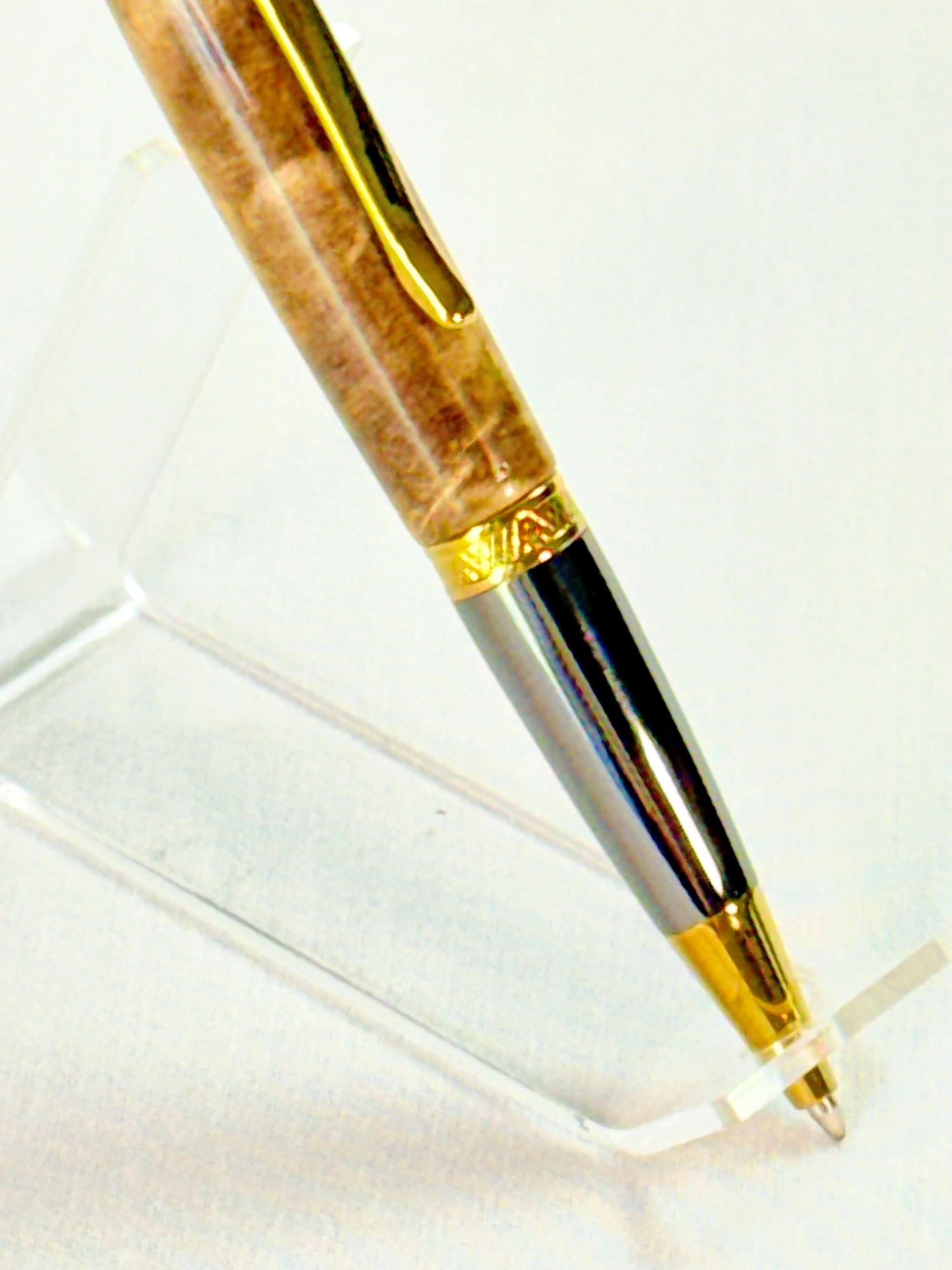 The Buckeye Burlwood Body is beautiful, and matched up with the Ti Gold and Gunmetal trim makes a stunning piece that will be the envy of everyone in the office. A totally great gift for him or her. Choose pen A, B, or C for your order.
