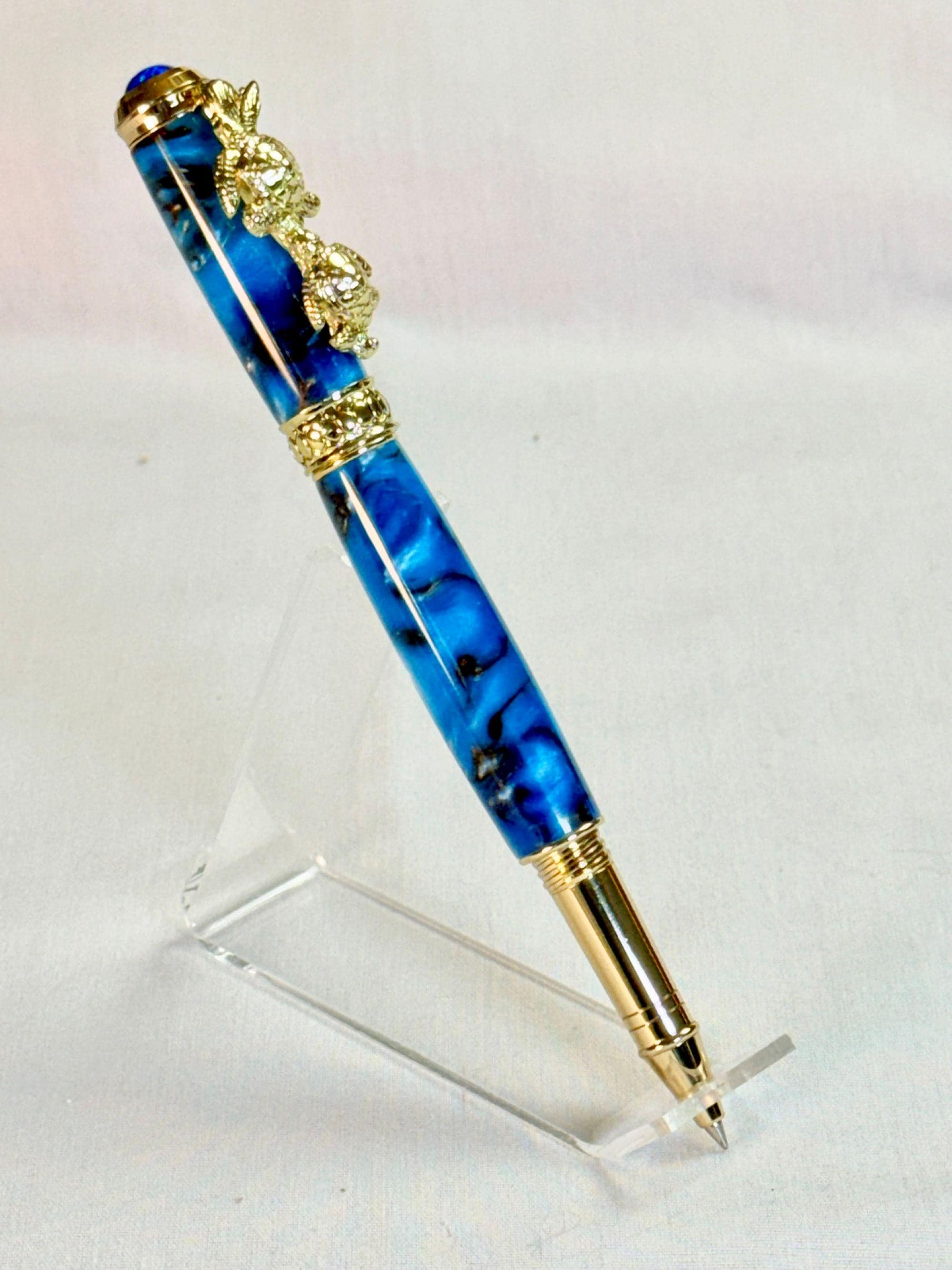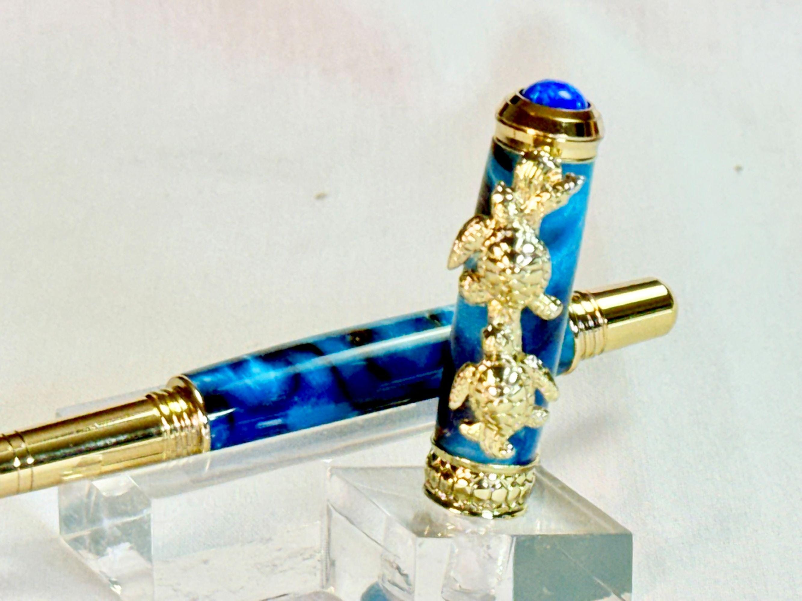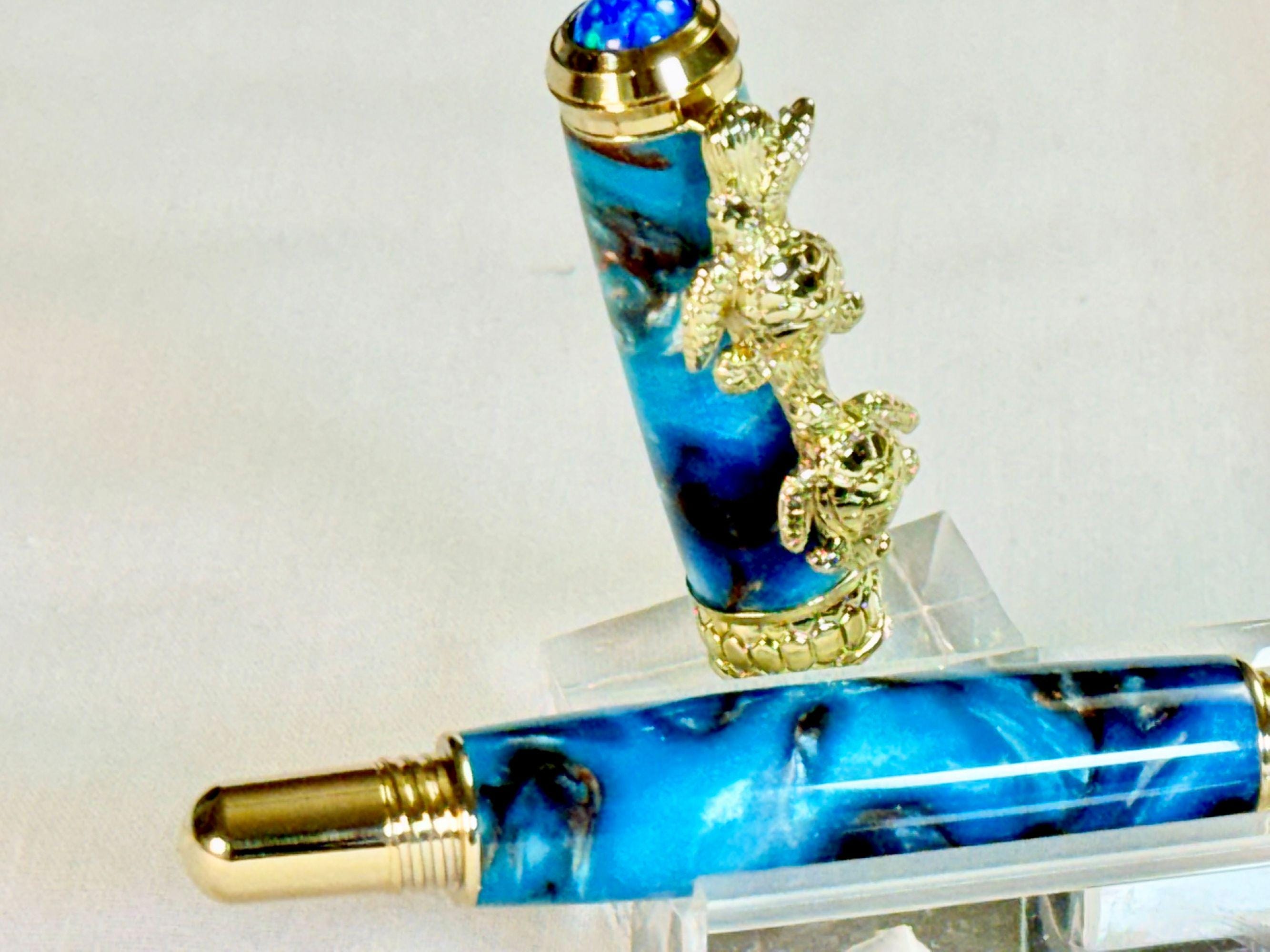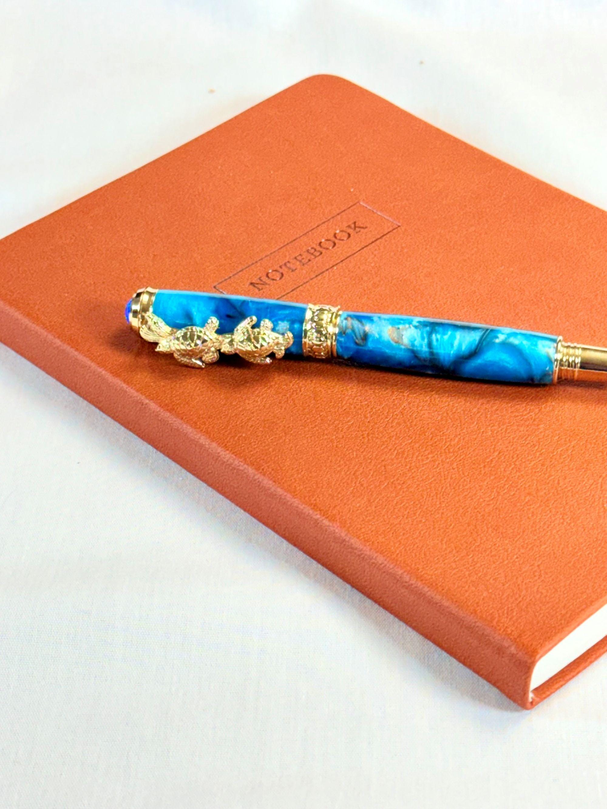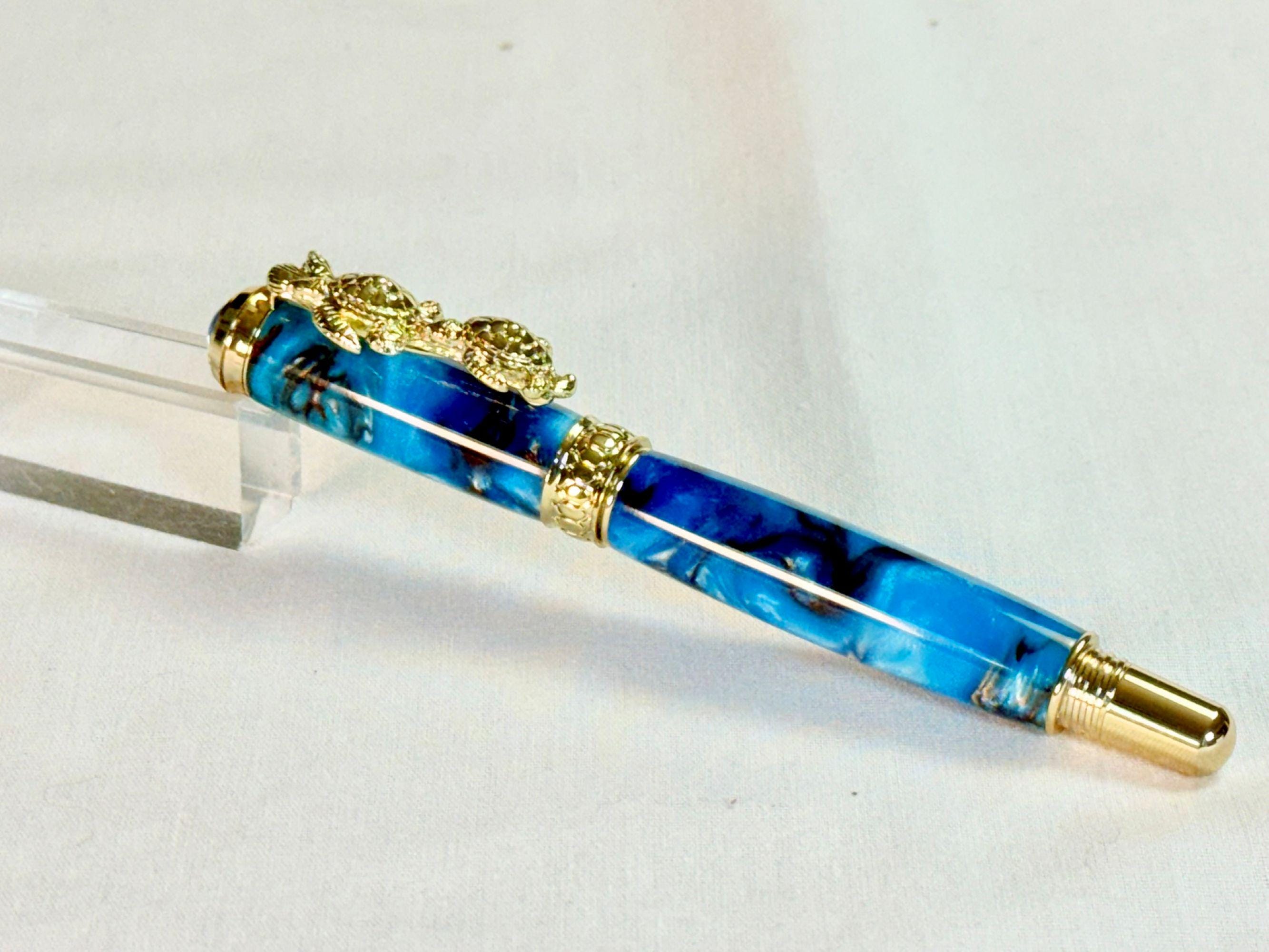 Celebrate your love of the sea with this handcrafted turtle-themed pen, finished with stunning 24k gold and a swirl of tropical ocean colors. You have the option of either a Fountain Pen, or Rollerball Pen