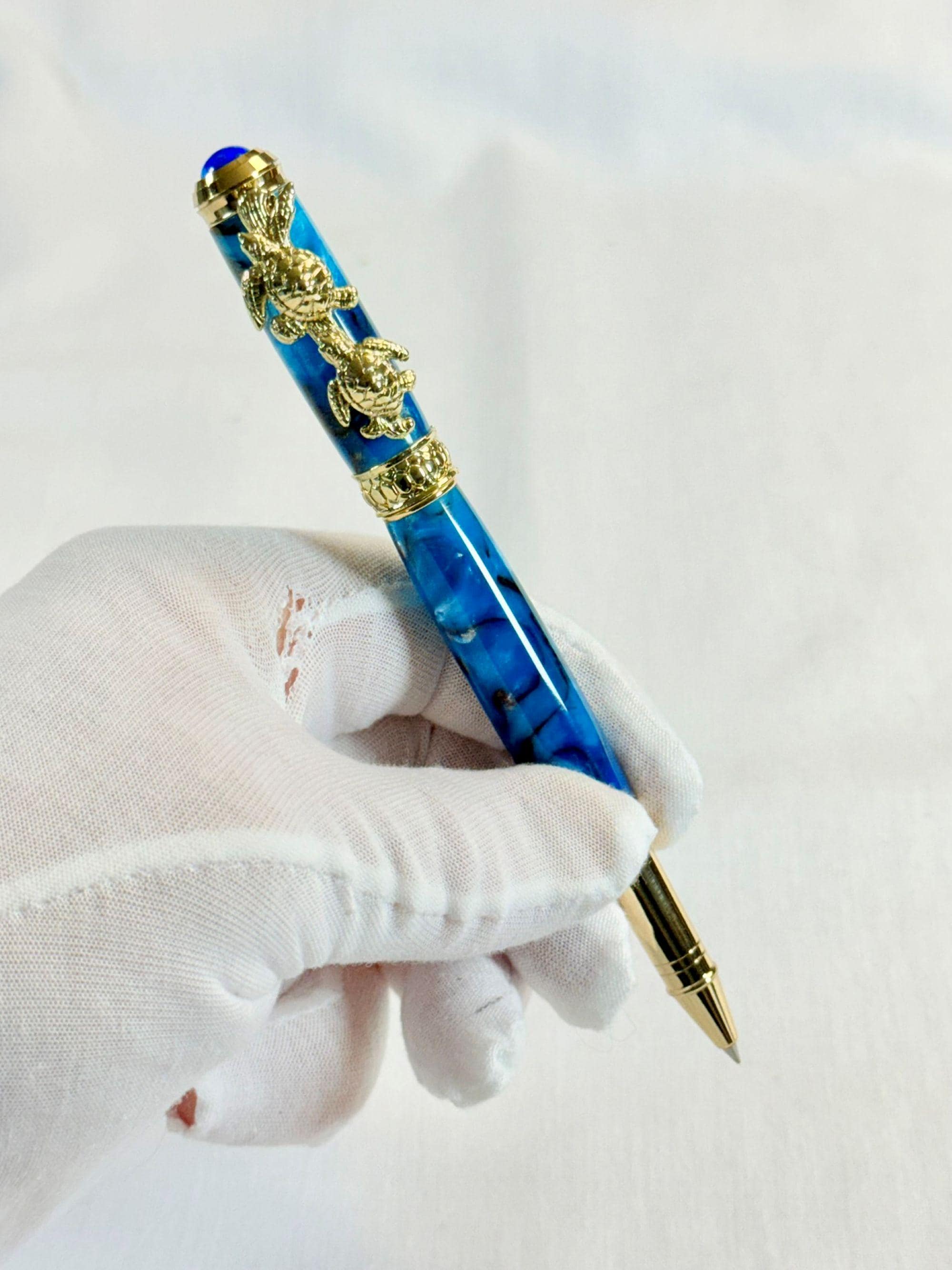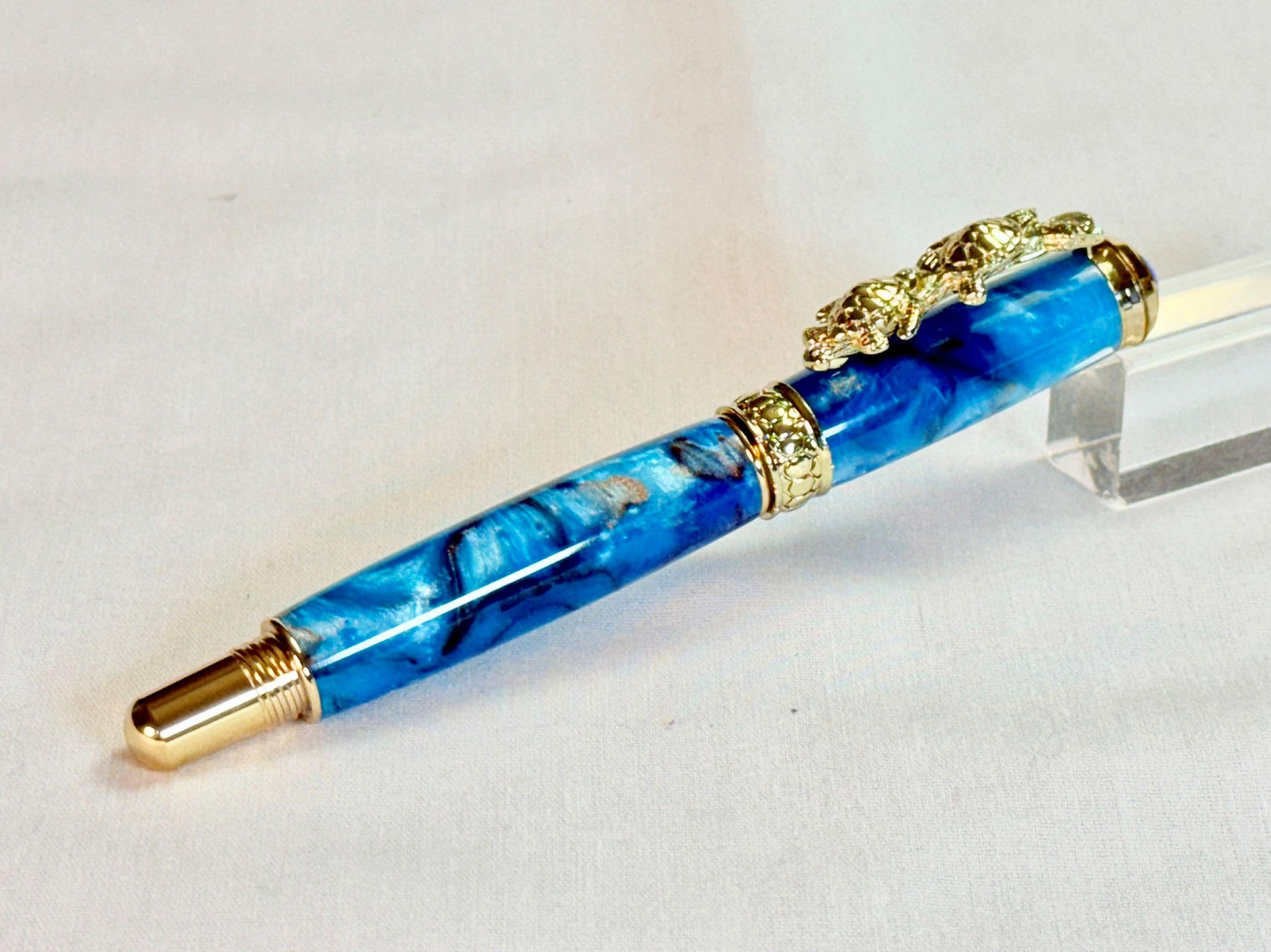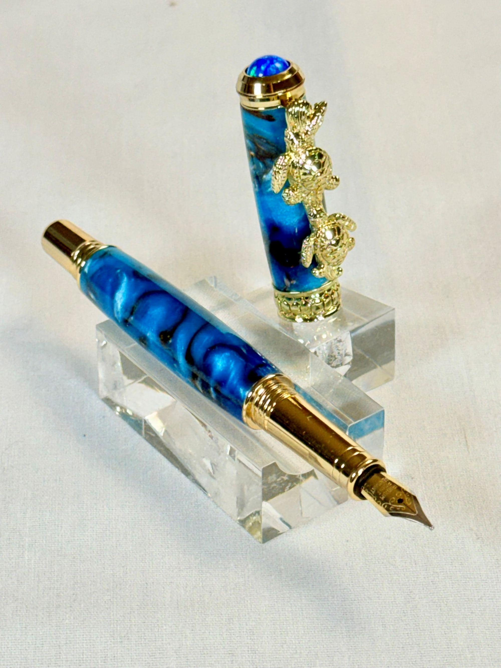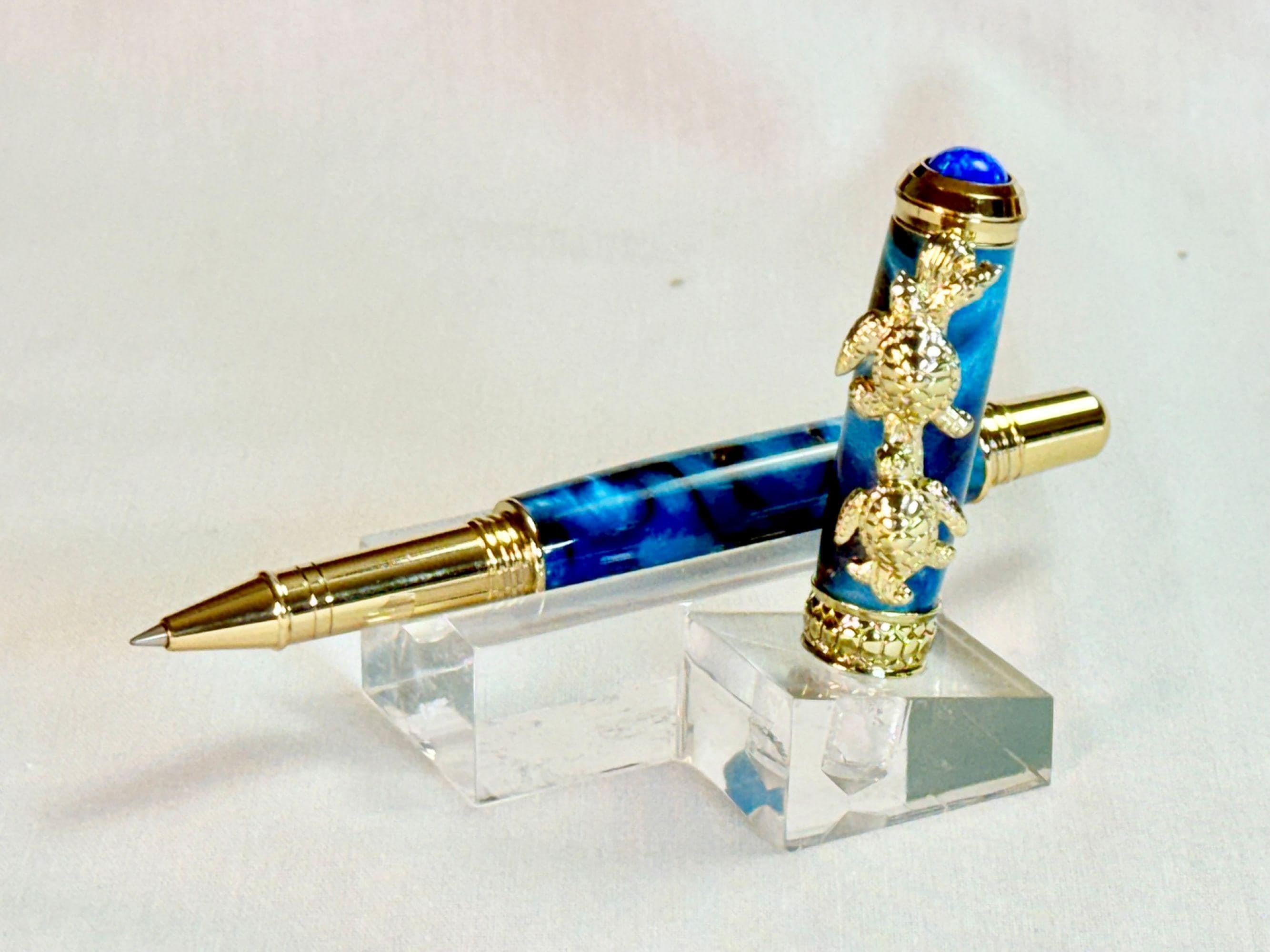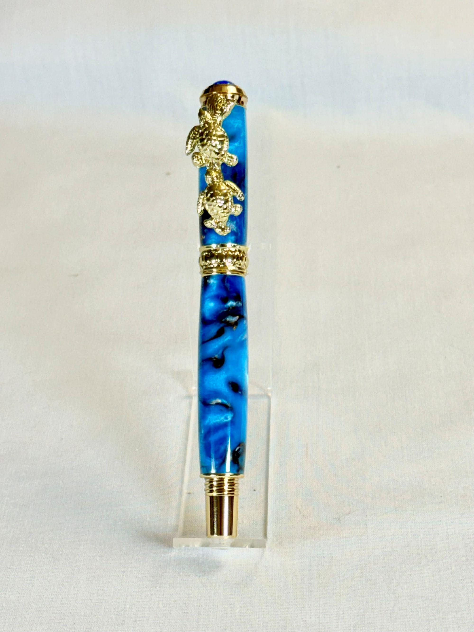 Celebrate your love of the sea with this handcrafted turtle-themed pen, finished with stunning 24k gold and a swirl of tropical ocean colors. You have the option of either a Fountain Pen, or Rollerball Pen