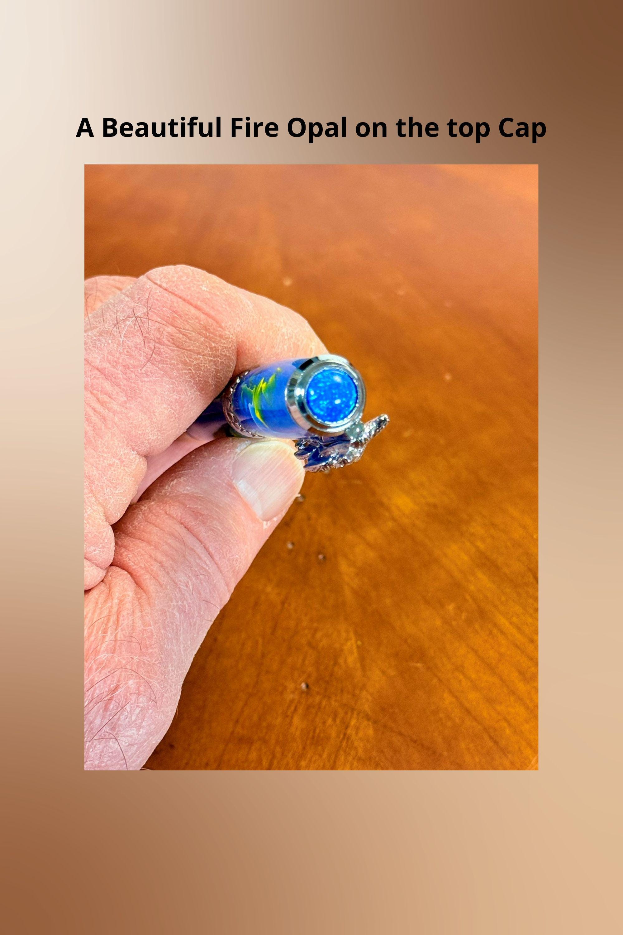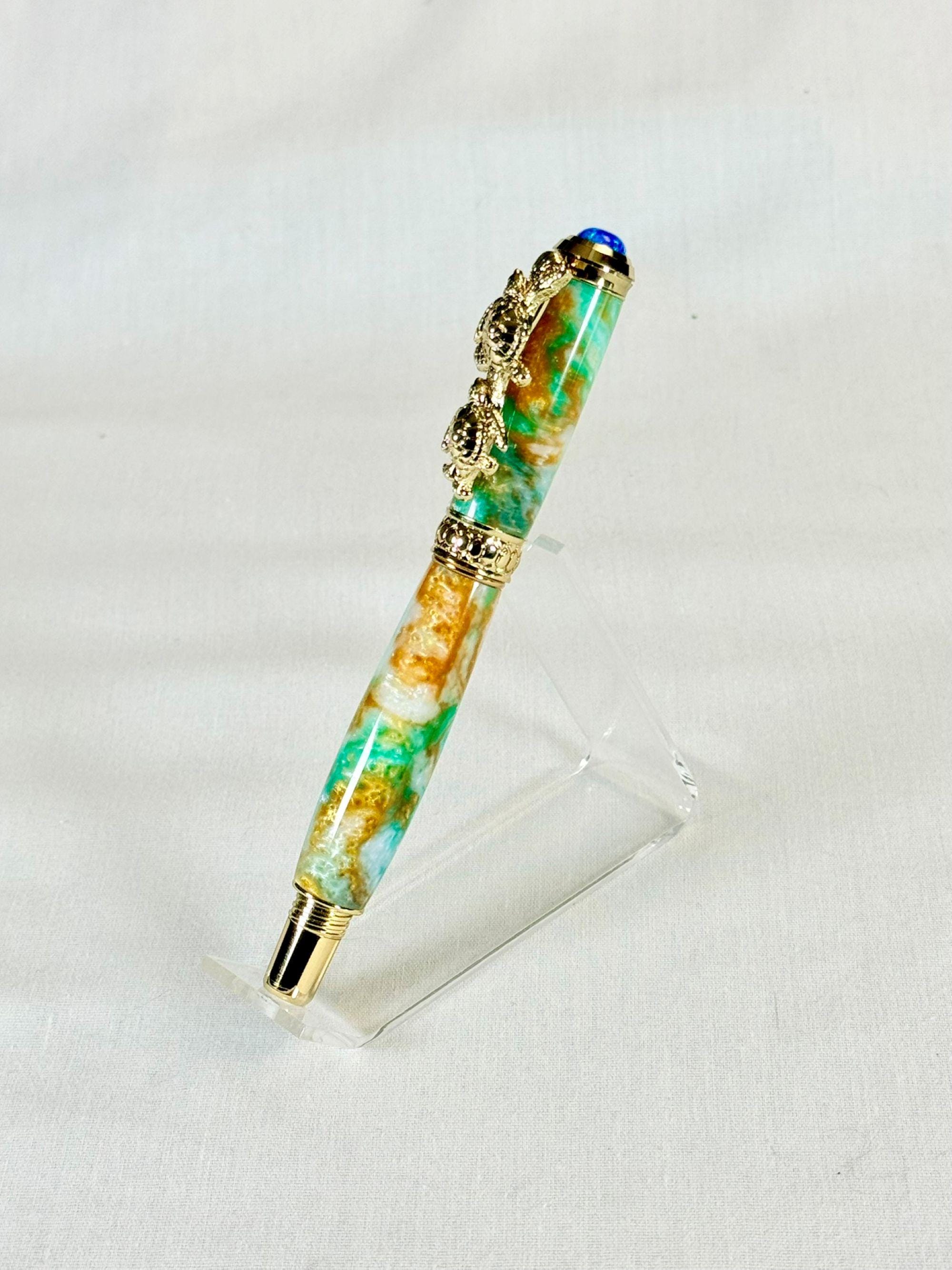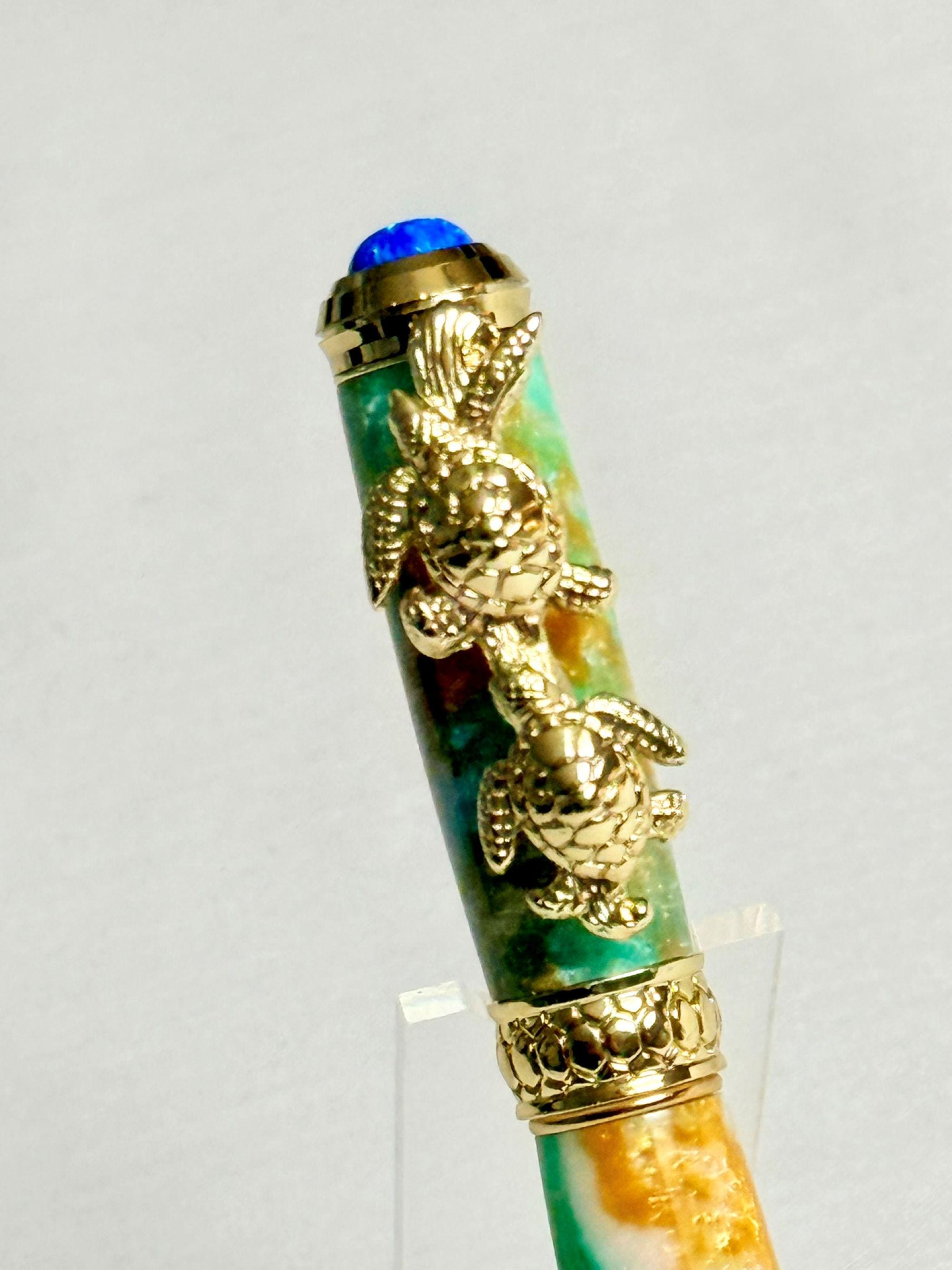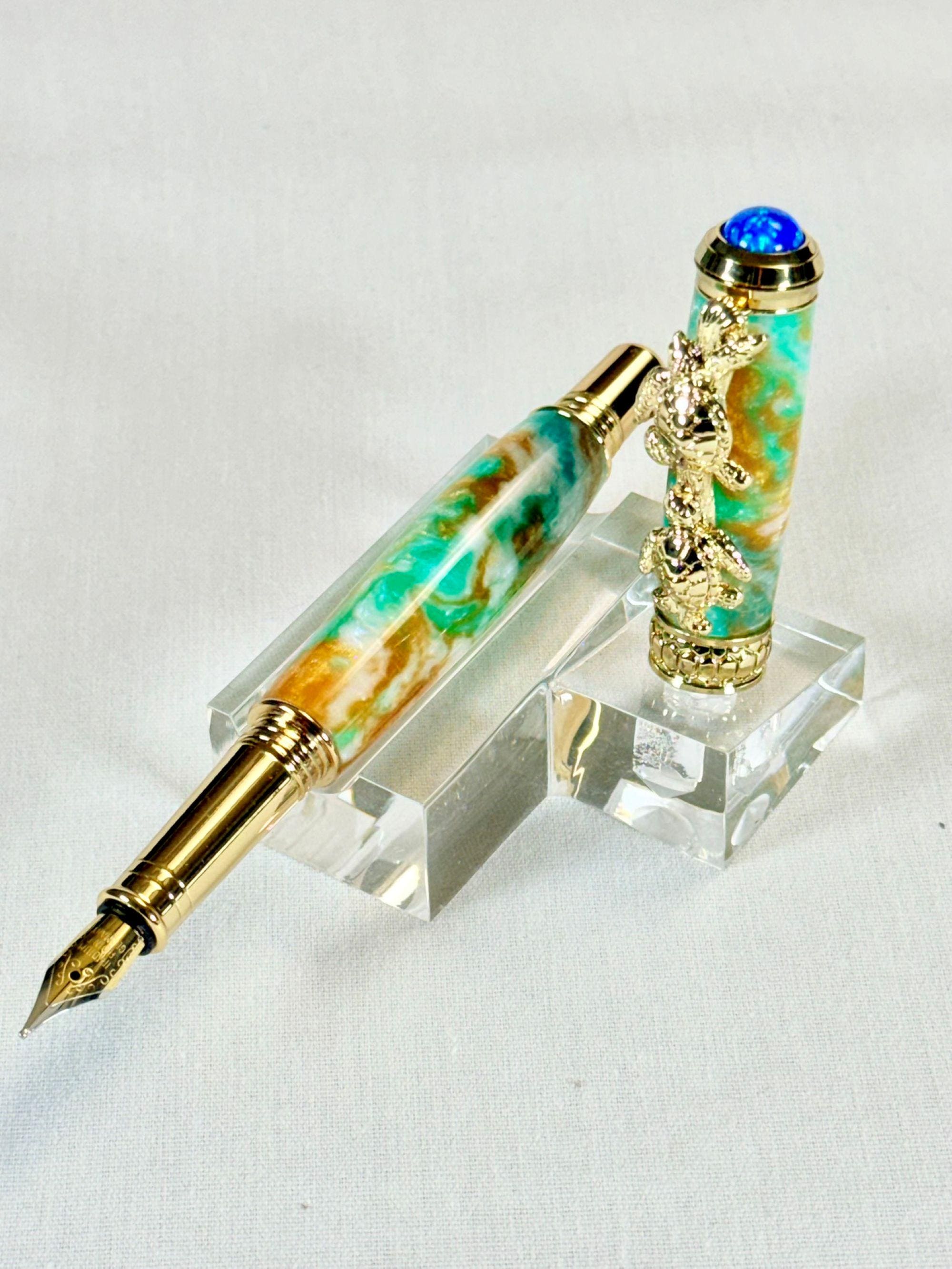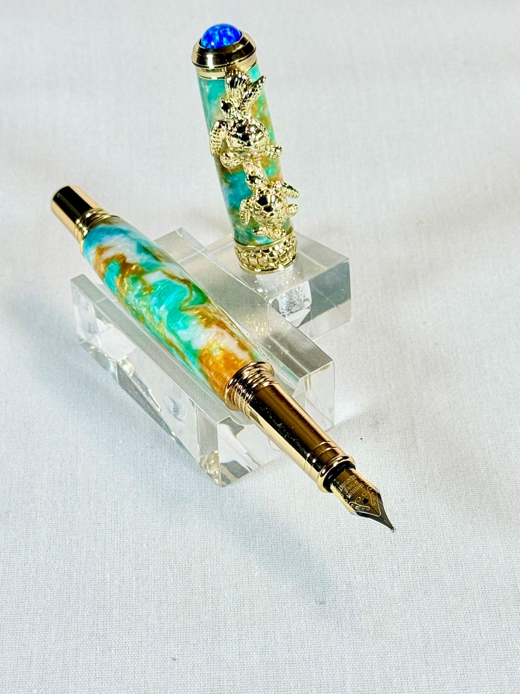 Dive into endless summer vibes with this handmade Sea Turtle Fountain Pen, featuring 24k gold accents and a sparkling Fire Opal top.