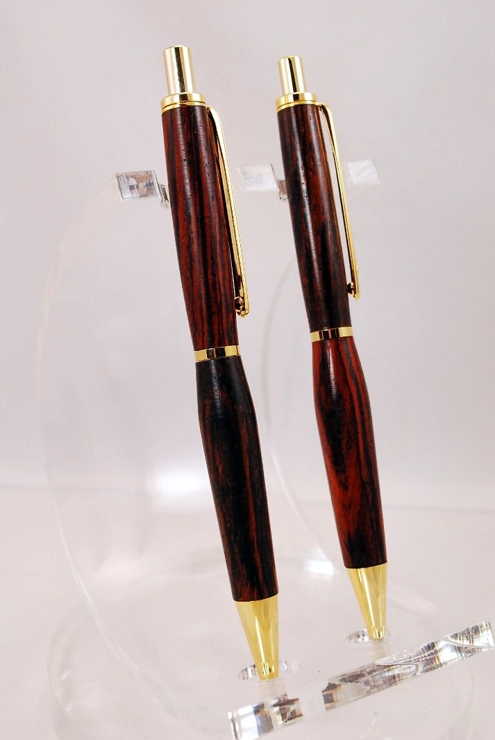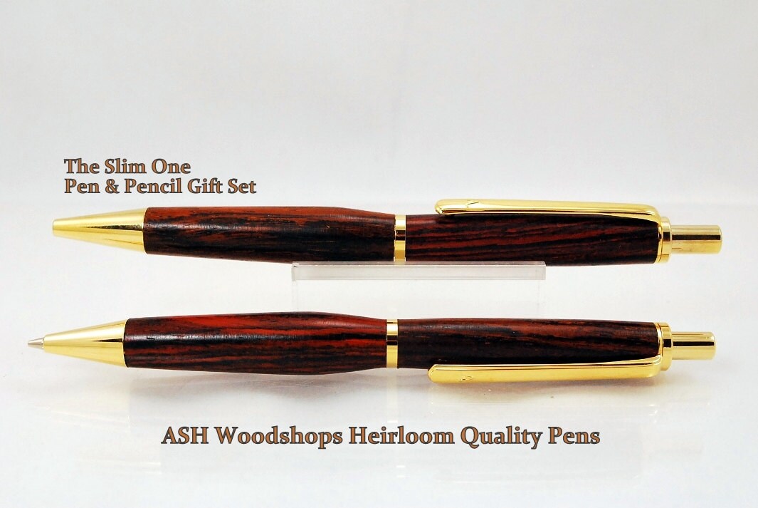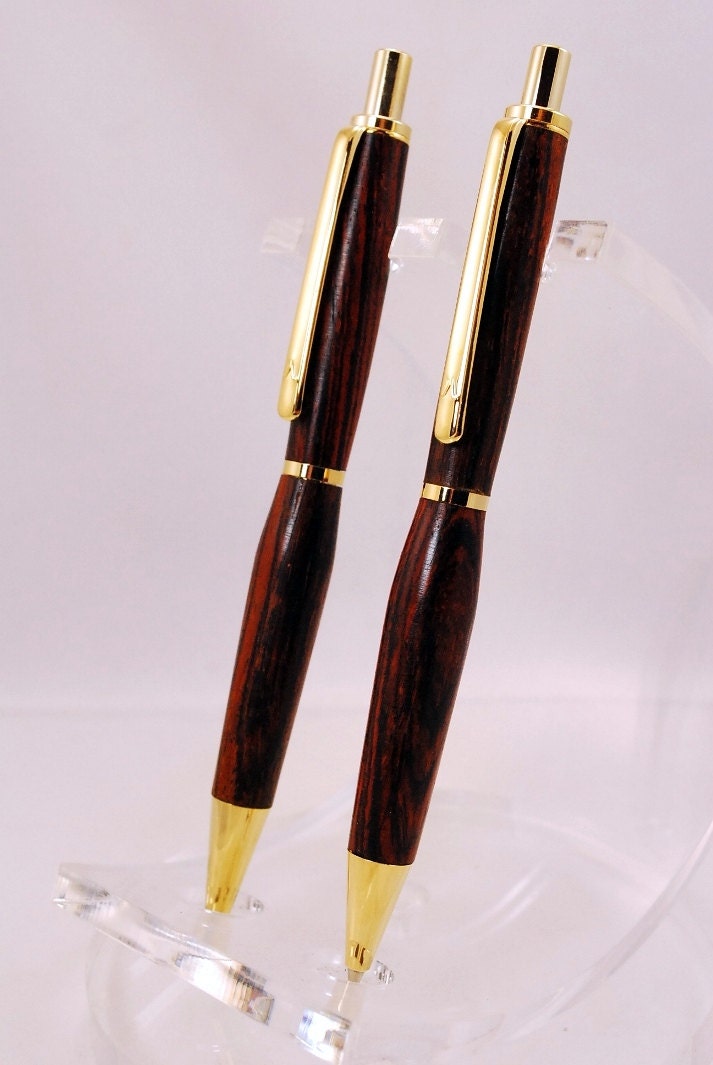 Slim design. Compact. Perfect for the lover of all things wood. Perfect for the budget. 10K Gold Trim. The bodies are made from Cocobolo Wood that has beautiful gold and red iridescent grain. Standard Parker type ink refill, click style pen. The Click type pencil uses 0.7mm lead. Both the lead and ink refills are common and found at any office supply. This is a fantastic gift for your special someone who had discriminating taste.