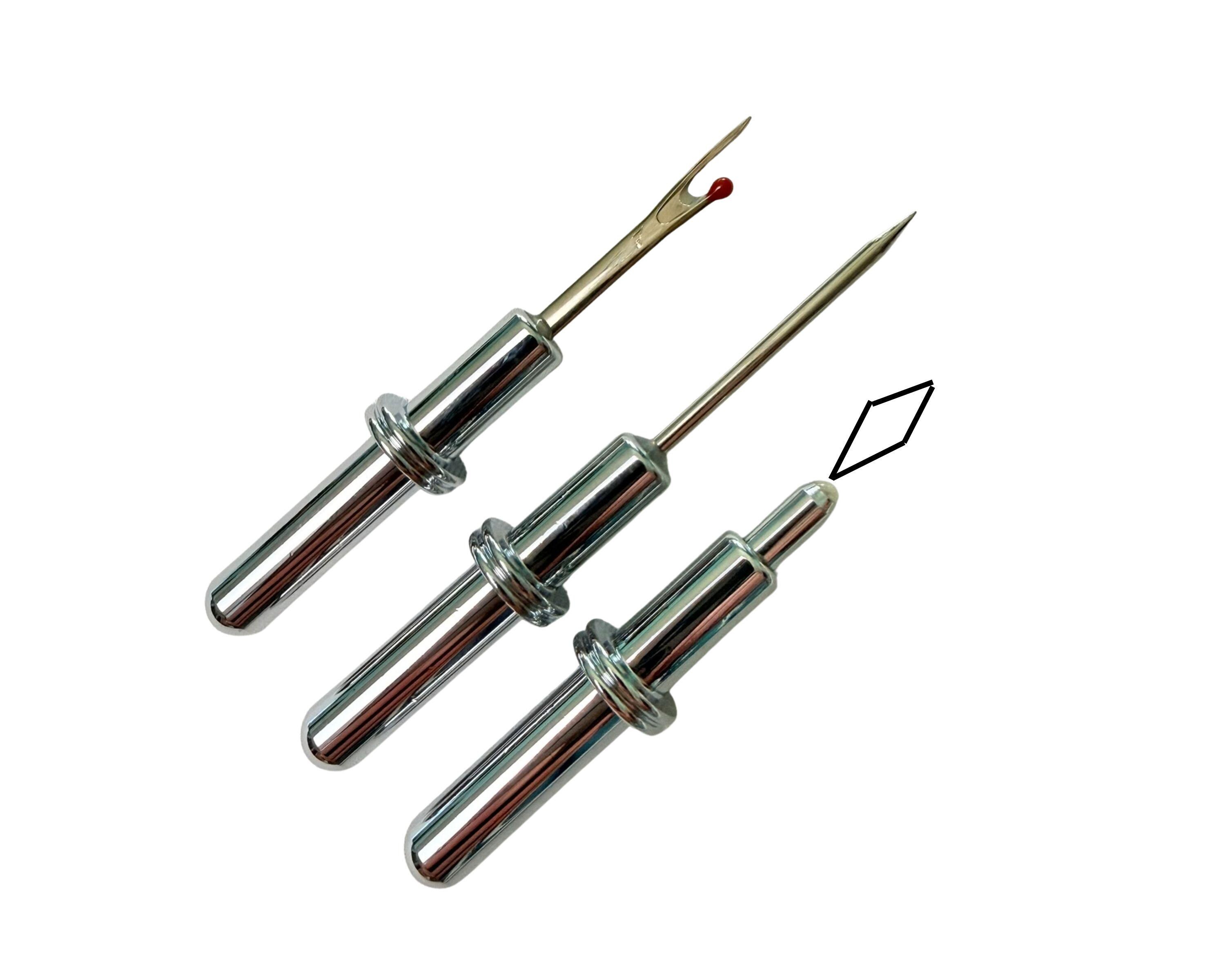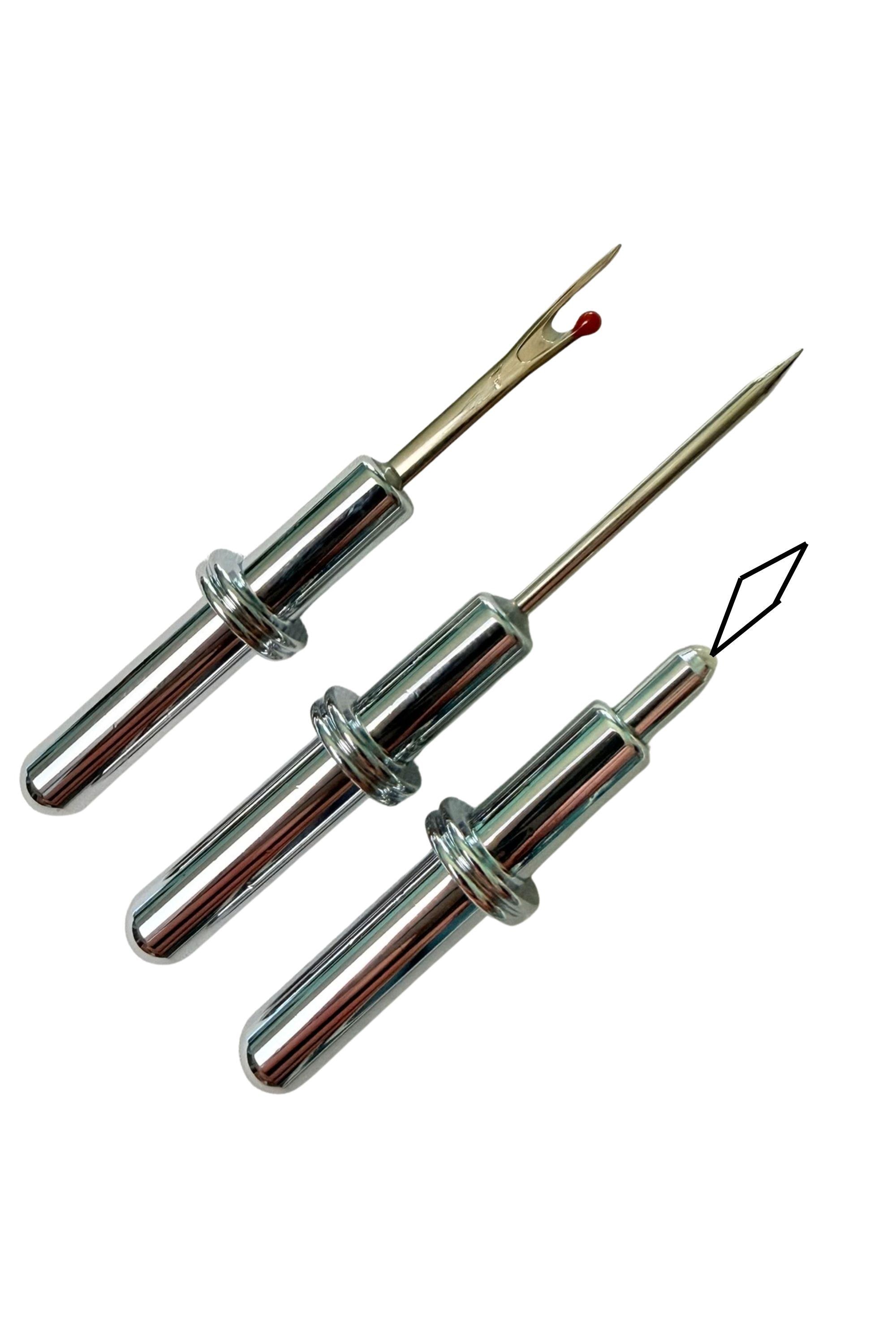 The Seam Ripper Stiletto Combo, Double Needle Threader, Single Seam Ripper and Seam Ripper Necklace.