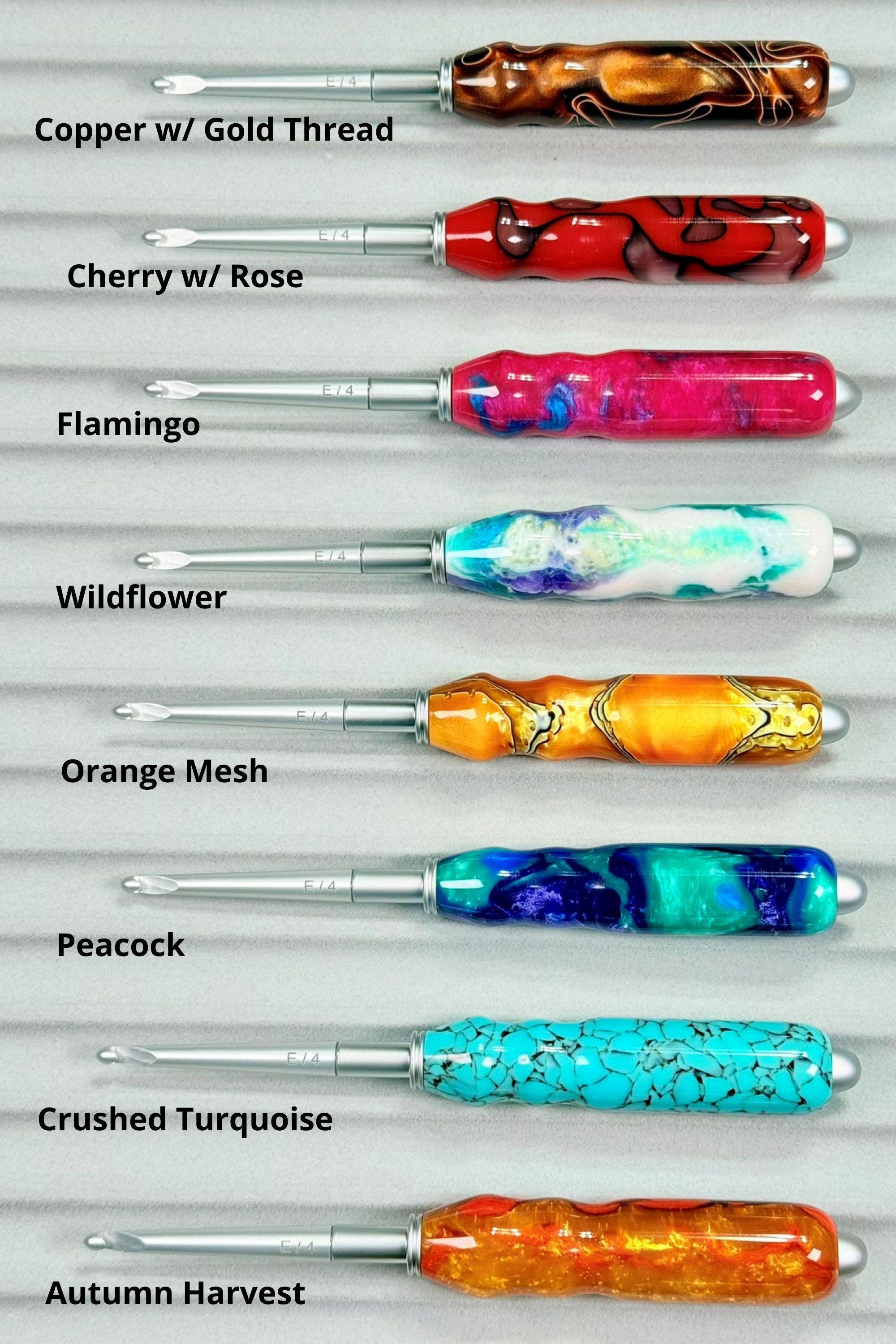 Say goodbye to hand fatigue and hello to comfort with our ergonomic crochet handle, handcrafted to fit naturally in your hand while reducing strain on fingers, wrists, and joints. This #2 of 3 custom Color Made To Order Listings. These beautiful crochet hook handles are available in more than 200 colors! More than any other seller on Etsy! In fact, all the same colors as our 2-in1 Seam Rippers!