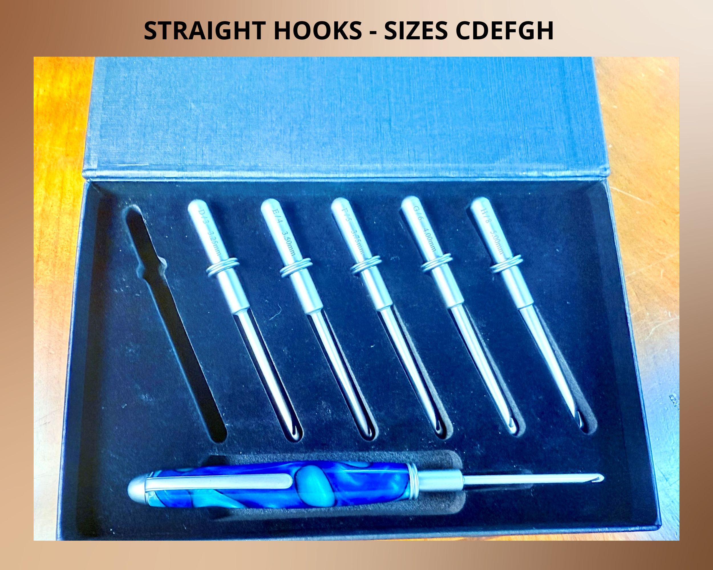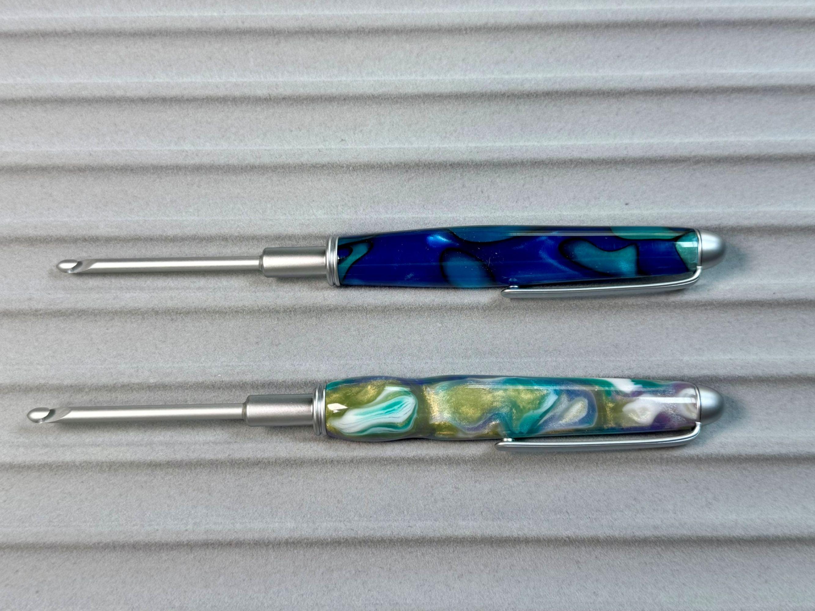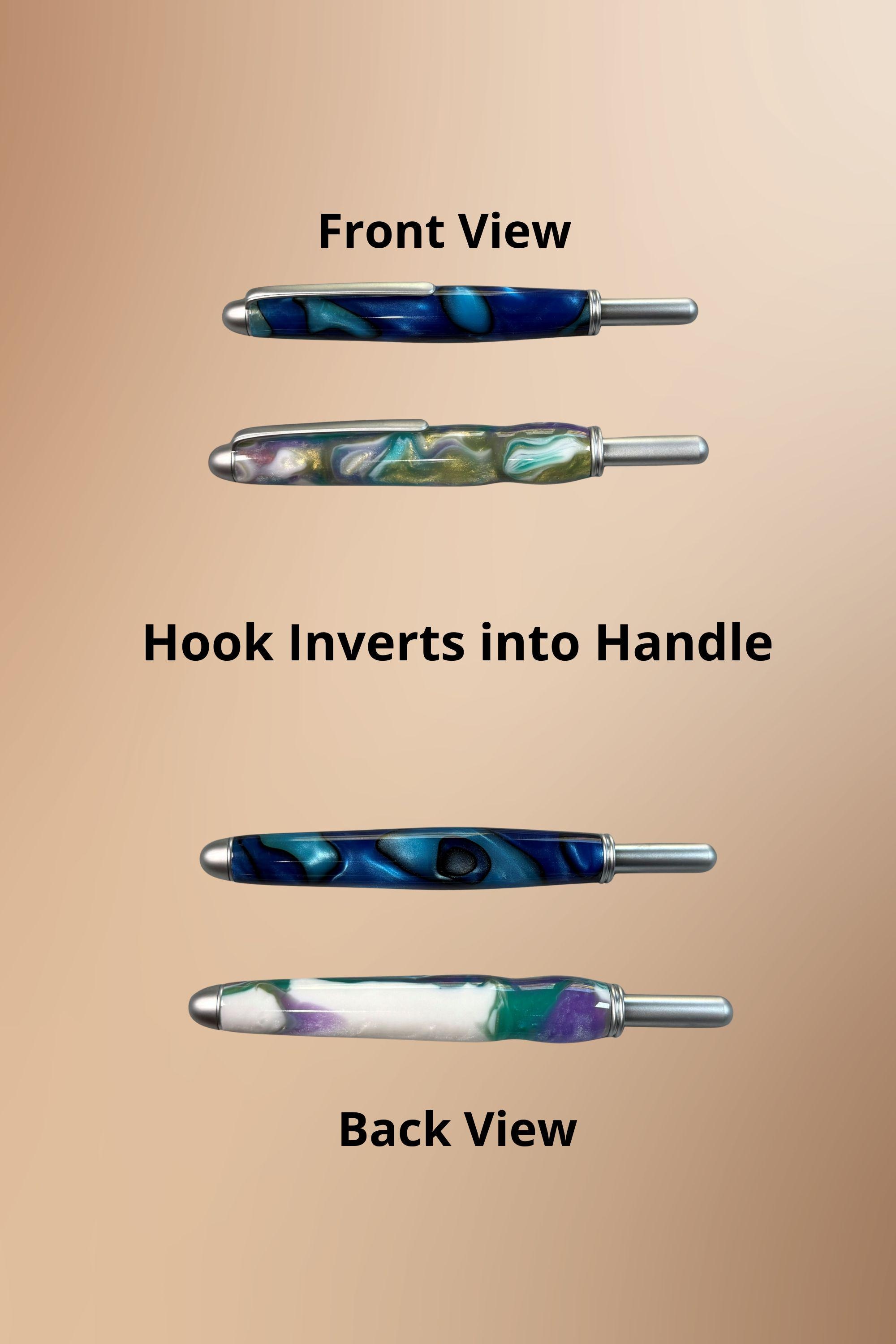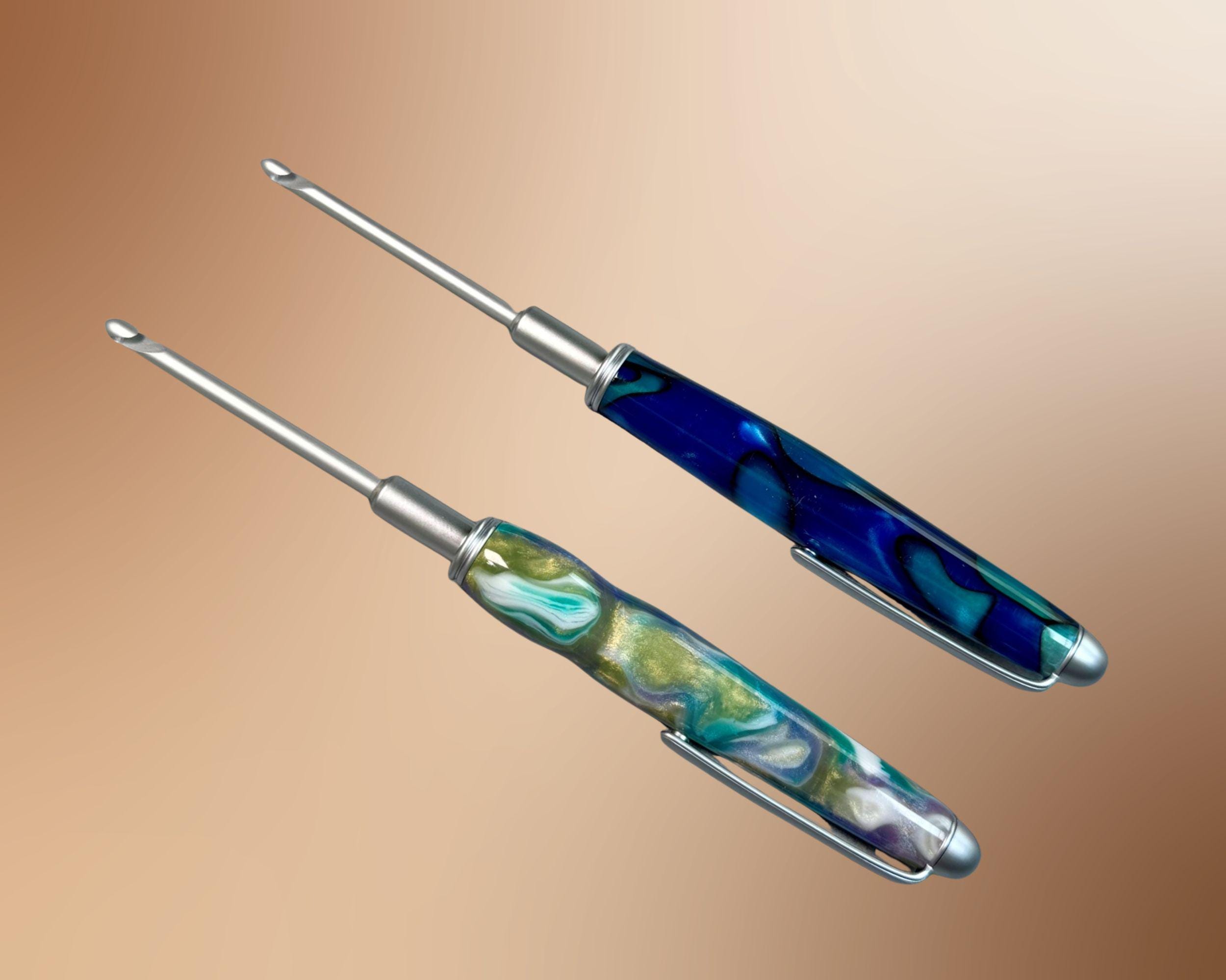 The aluminum straight crochet hooks with satin chrome trim pairs beautifully with the handle. The smart design allows you to easily swap hook sizes or invert the hook into the handle for safe, compact storage — perfect for travel or crafting on the go. The handle design in this listing also includes a pocket clip making the tool even more versatile.