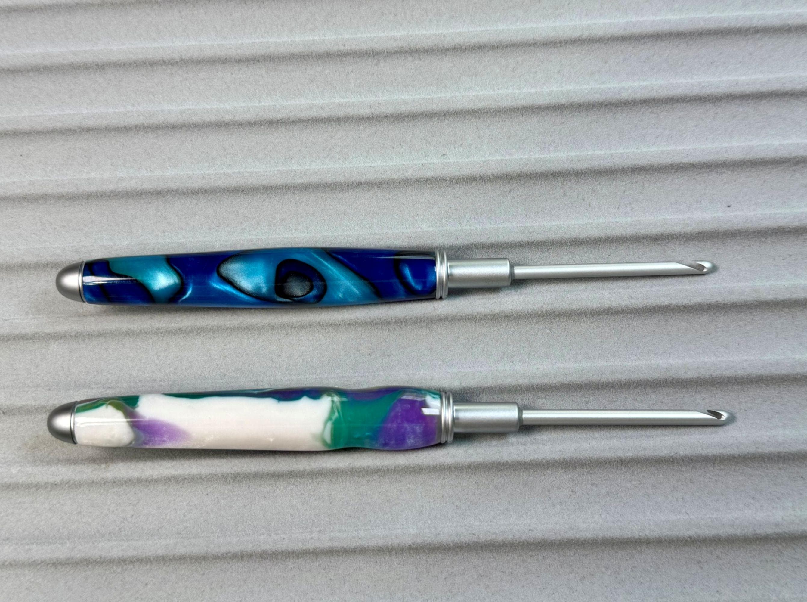 Say goodbye to hand fatigue and hello to comfort with our crochet handle, handcrafted to fit naturally in your hand while reducing strain on fingers, wrists, and joints. Designed for crocheters, fiber artists, and crafters who create for hours, this wider-diameter handle gives you superior control, stability, and comfort compared to traditional thin metal hooks. This listing is two of our most popular colors with Straight (non-tapered) crochet hooks