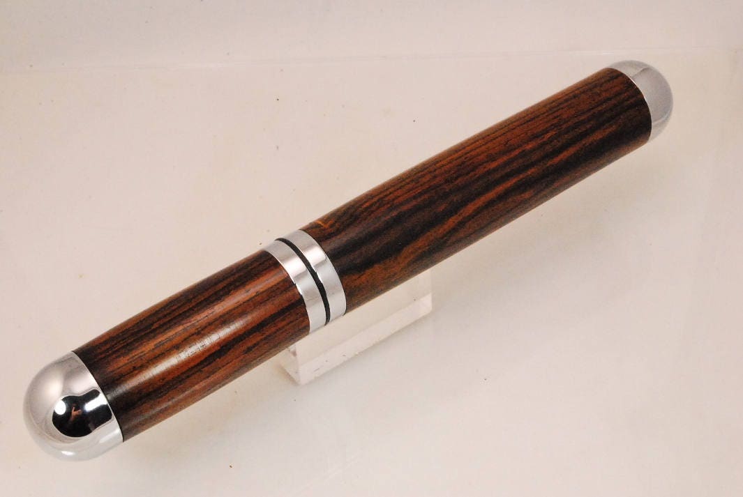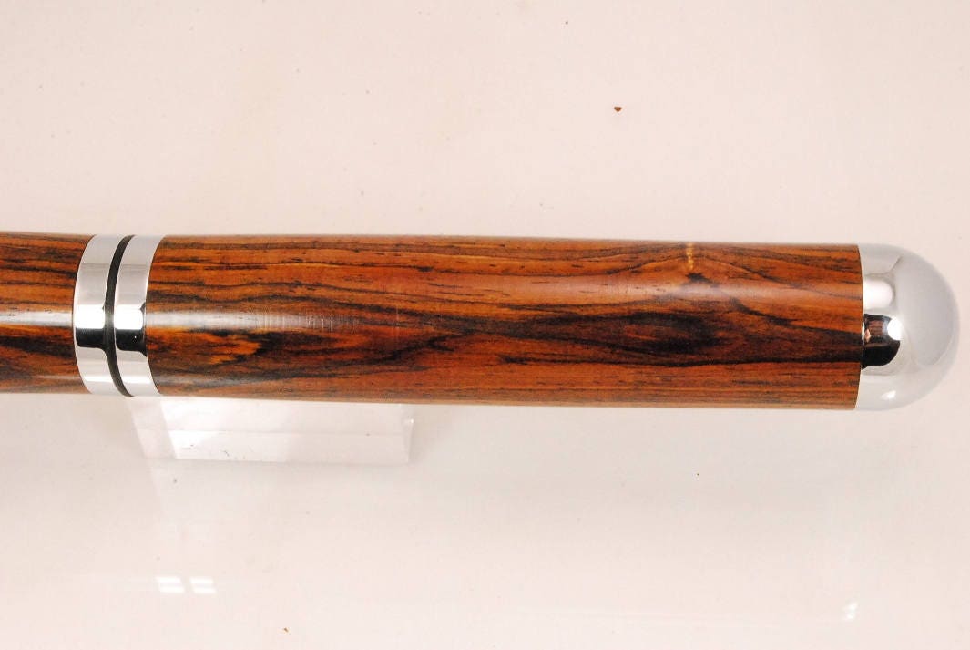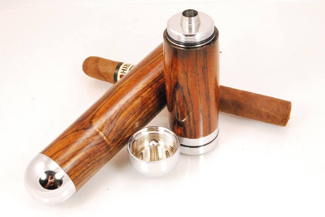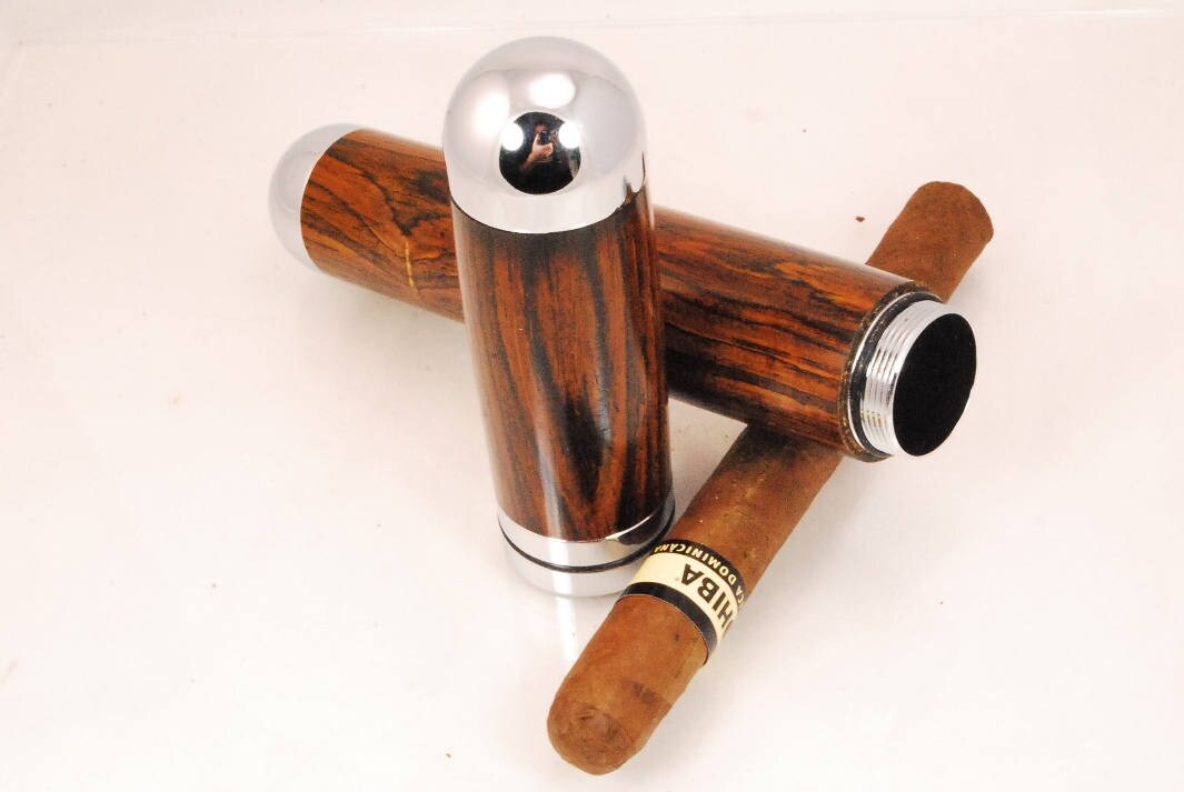 The cigar tube is hand made from chrome plated metal components and exquisite exotic hardwood called Cocobolo. It is designed for cigar up to 52 gauge and will hold and protect cigars up to 7 inches in length. There are o-rings on each threaded part to hold an airtight seal to not only protect your cigar from breakage, but also protect its perfect moisture content while in transit for a perfect fresh smoke.