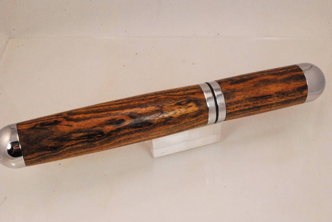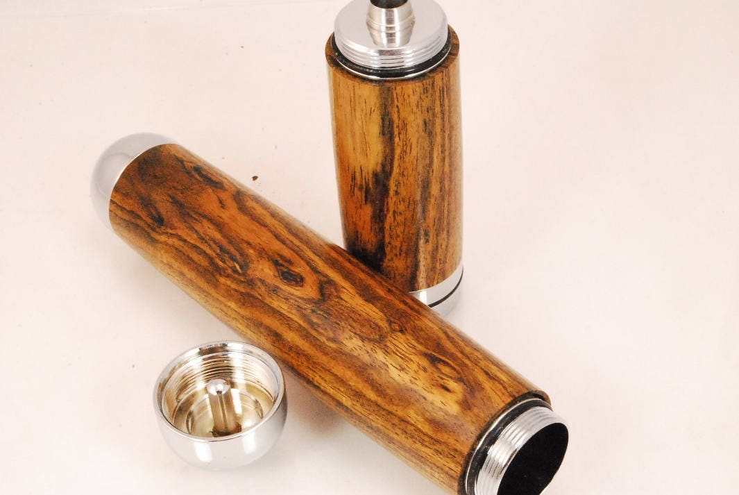 The cigar tube is hand made from chrome plated metal components and exquisite exotic hardwood called Bocote. It is designed for cigar up to 52 gauge and will hold and protect cigars up to 7 inches in length. There are o-rings on each threaded part to hold an airtight seal to not only protect your cigar from breakage, but also protect its perfect moisture content while in transit for a perfect fresh smoke.