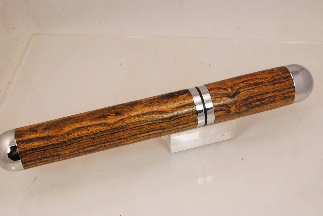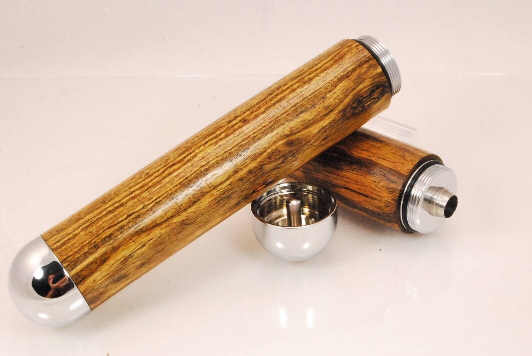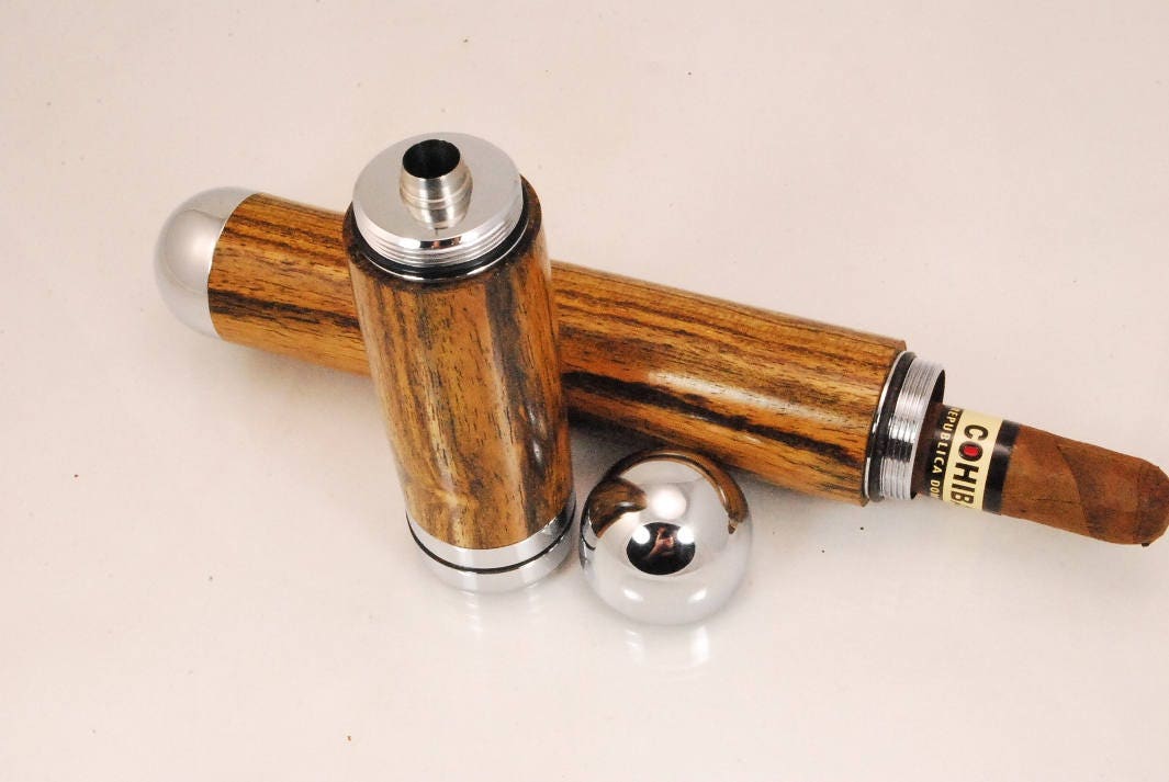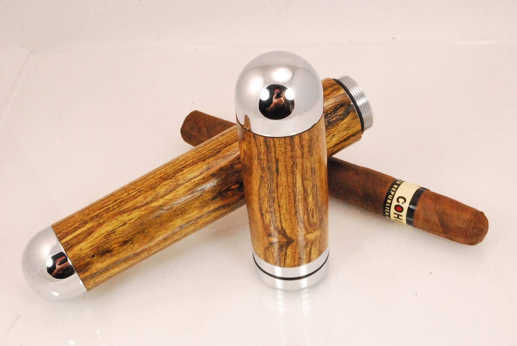 The cigar tube is hand made from chrome plated metal components and exquisite exotic hardwood called Bocote. It is designed for cigar up to 52 gauge and will hold and protect cigars up to 7 inches in length. There are o-rings on each threaded part to hold an airtight seal to not only protect your cigar from breakage, but also protect its perfect moisture content while in transit for a perfect fresh smoke.
