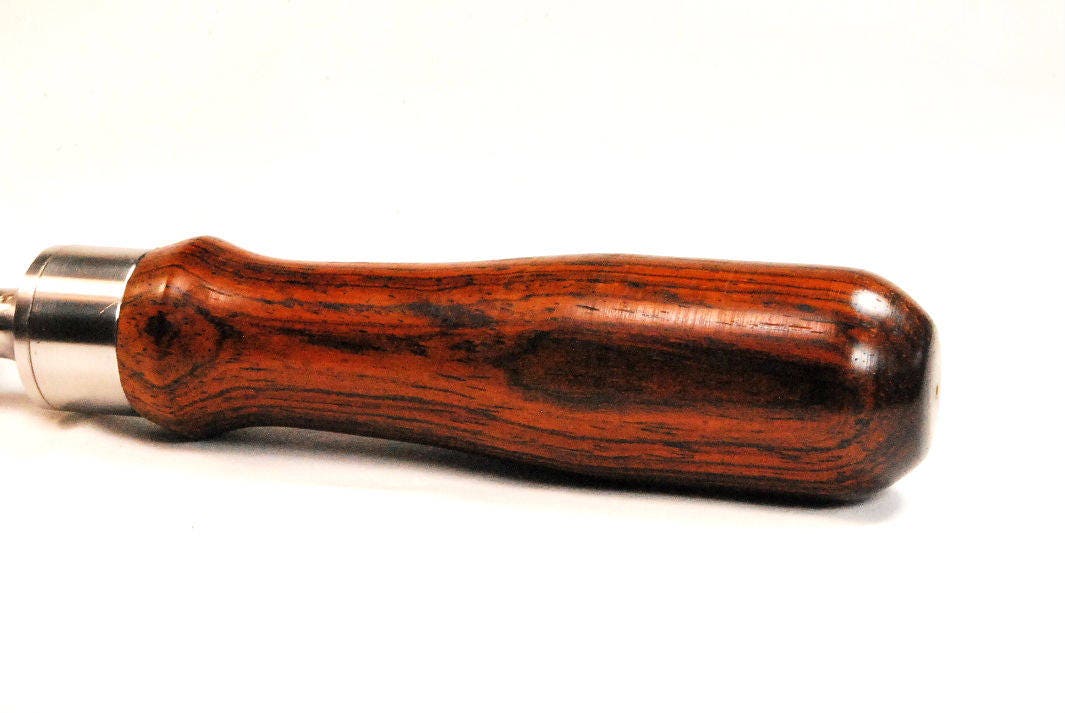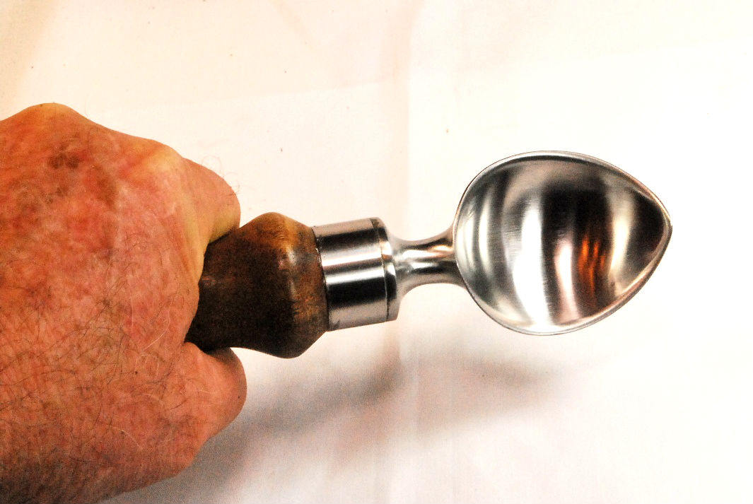 The beautiful wooden handle is handmade by turning a piece of hard Claro Walnut Wood wood on a lathe . The Scoop itself is solid stainless steel. This should last a lifetime. This is a large scoop with very stout handle. There won't be any "bent spoons" in your house any more from scooping hard frozen delights when you have one of these.